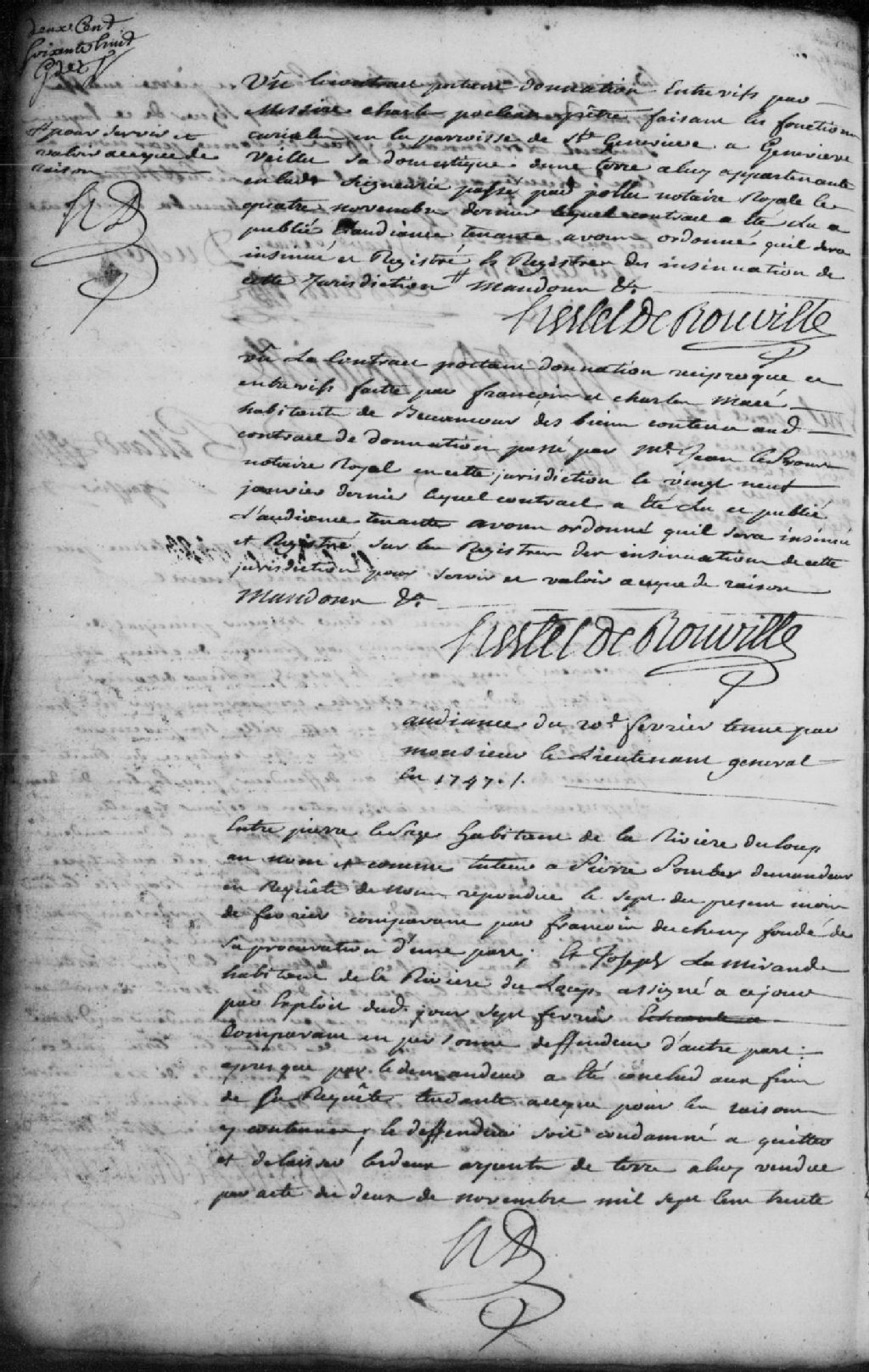 Requête entre Pierre leSage (Lesage), habitant de la Rivière-du-Loup, au nom et comme tuteur à Pierre Pomber (Pombert), demandeur, comparant par François Ducheny, contre Joseph Lamirande, habitant de la Rivière-du-Loup, défendeur, afin que ledit défendeur soit condamné à quitter et délaisser les 2 arpents de terre à lui vendus par un acte du 2 novembre 1735, à lui en payer les fruits du jour de la possession ; les parties sont renvoyés à se pourvoir ainsi qu'ils aviseront bon, 20 février 1747, Archives nationales à Trois-Rivières, Fonds Juridiction royale des Trois-Rivières, (04T,TL3,S11,P3678).