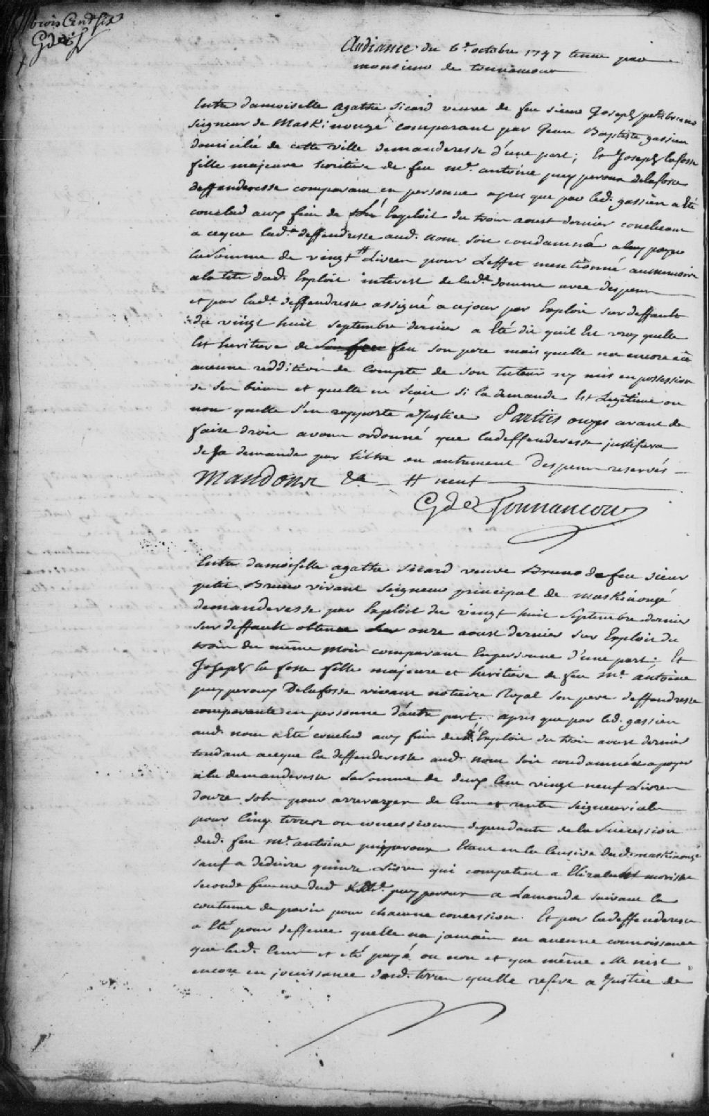 Requête entre Agathe Sicard, veuve de feu Joseph Petit Bruno (Bruneau), seigneur de Maskinongé, comparant par Jean-Baptiste Gassien (Gatien), domicilié à Trois-Rivières, demanderesse, contre Josèphe Lafosse, fille majeure, héritière de feu maître Antoine Puypéroux de Lafosse, défenderesse, pour la somme de 29 livres pour l'effet mentionné à la tête de l'exploit du 3 août 1747 ; il est ordonné que la défenderesse justifiera de sa demande par titre ou autrement, dépens réservés, 6 octobre 1747, Archives nationales à Trois-Rivières, Fonds Juridiction royale des Trois-Rivières, (04T,TL3,S11,P3735).
