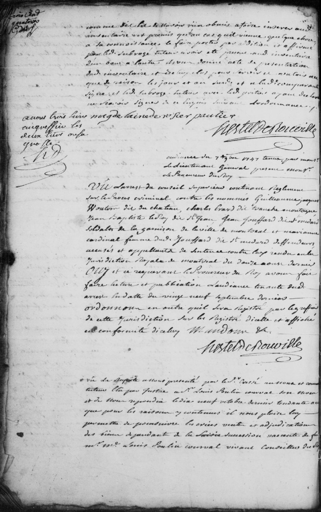 - Le titre complet de la pièce se lit comme suit : Adjudication des biens dépendants de la succession vacante de feu maître Louis Poulin Courval, vivant conseiller du Roi et son lieutenant général en ce siège, à la requête du sieur Cressé, au nom et comme tuteur élu par justice de Louis Poulin Courval, son neveu, afin de lui permettre de poursuivre les criées, vente et adjudication desdits biens ; interposé un décret judiciaire adjugé par vente et délivrance actuelle et réelle et fonder propriété audit Claude Poulin Cressé, à savoir l'emplacement à Trois-Rivières dit "Le Platon", ensemble le moulin à farine pour la somme de 500 livres, une maison de bois sise aussi à Trois-Rivières sur la "Place d'Armes" avec un hangar et une boulangerie et un autre petit emplacement sur ladite "Place d'Armes" avec une mauvaise étable ou écurie pour la somme de 500 livres et le domaine principal, manoir et cinq huitièmes de la seigneurie de Nicolet, pour [...]