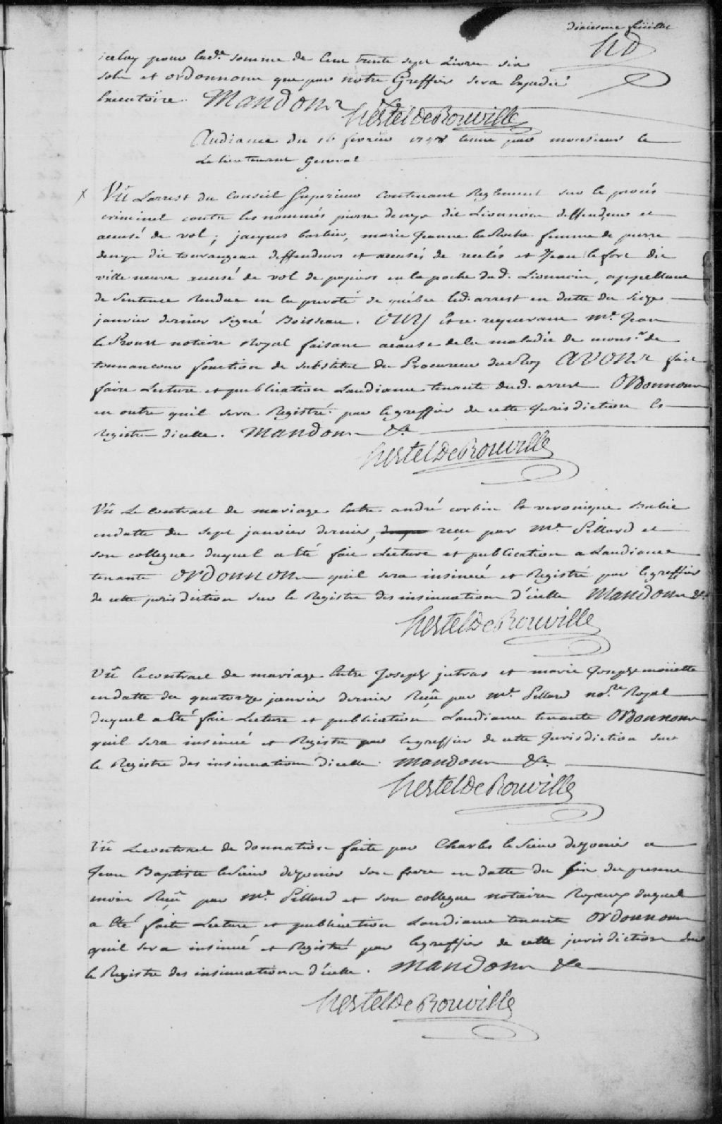 Lecture et publication du contrat de donation fait par Charles Lesieur Desonier (Desaulniers) à Jean-Baptiste Lesieur Desonier (Desaulniers), son frère, du 6 février 1748, reçu par maître Pillard et son collègue, notaires royaux; il est ordonné qu’il sera insinué et registré sur le registre d’insinuation de la Juridiction des Trois-Rivières par le greffier