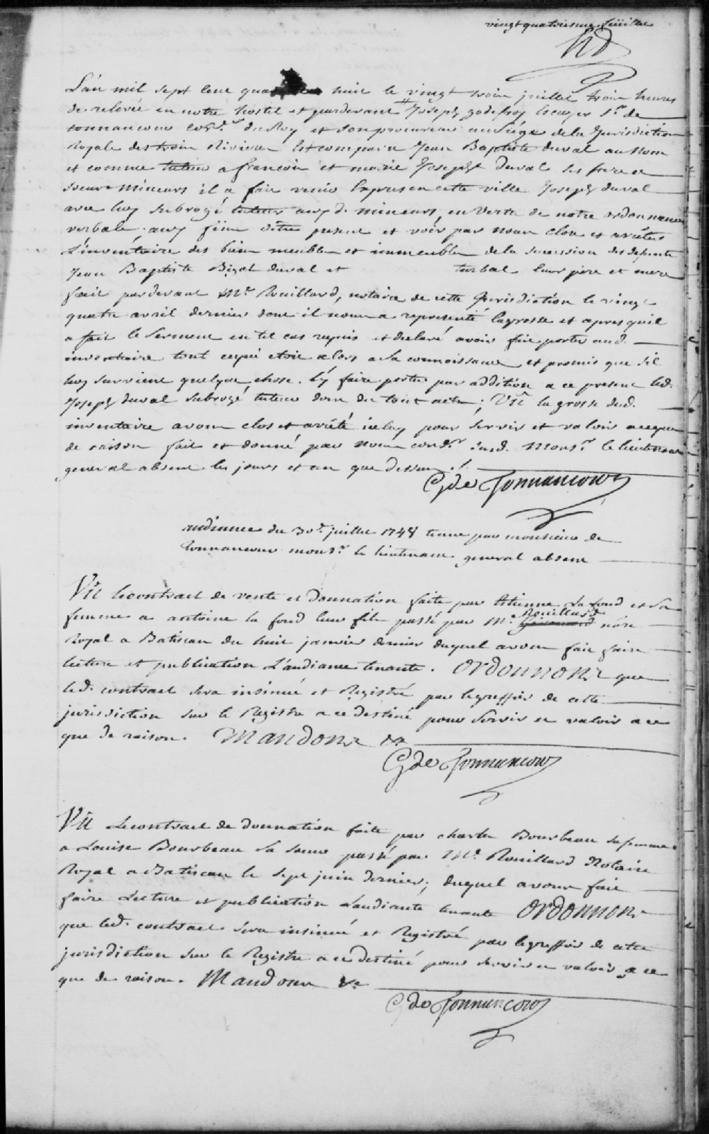 Comparution de Jean-Baptiste Duval, au nom et comme tuteur de François et Marie-Josèphe, ses frère et soeur mineurs, qui a fait venir Joseph Duval..., 9 juillet 1748, Archives nationales à Trois-Rivières, Fonds Juridiction royale des Trois-Rivières, (04T,TL3,S11,P3852).