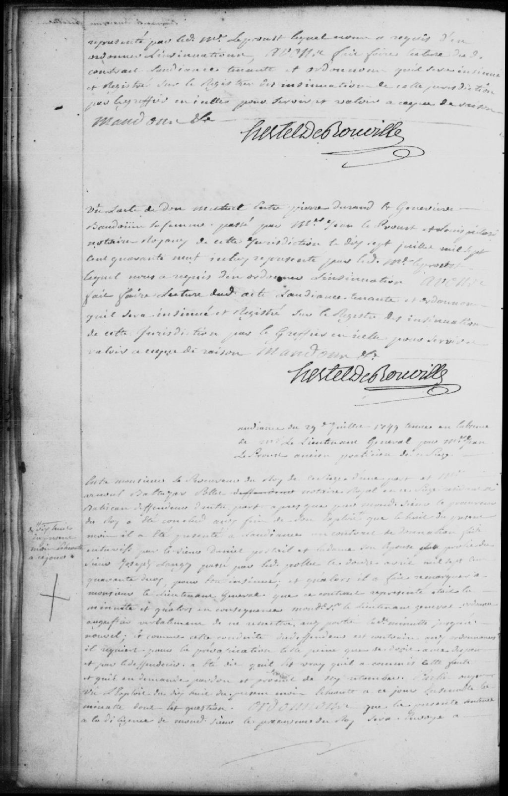 - Le titre complet de la pièce se lit comme suit : Requête de monsieur le procureur du Roi du siège des Trois-Rivières, demandeur, contre maître Arnould-Balthazar Pollet, notaire royal au siège des Trois-Rivières résidant à Batiscan, défendeur, pour requérir une peine pour la prévarication du défendeur pour avoir pris la minute du contrat de donation faite entre vifs par le sieur Daniel Portail et la dame son épouse au profit du sieur Joseph Langy (Langis, Delangy) au lieu de l¿original; le défendeur reconnaît son erreur et demande pardon; il est ordonné que la présente sentence à la diligence de monsieur le procureur du Roi sera envoyée à monsieur le procureur général du Roi au Conseil supérieur de Québec pour en conclure selon son jugement et le défendeur est condamné aux dépens liquidés à 3 livres et 18 sols.