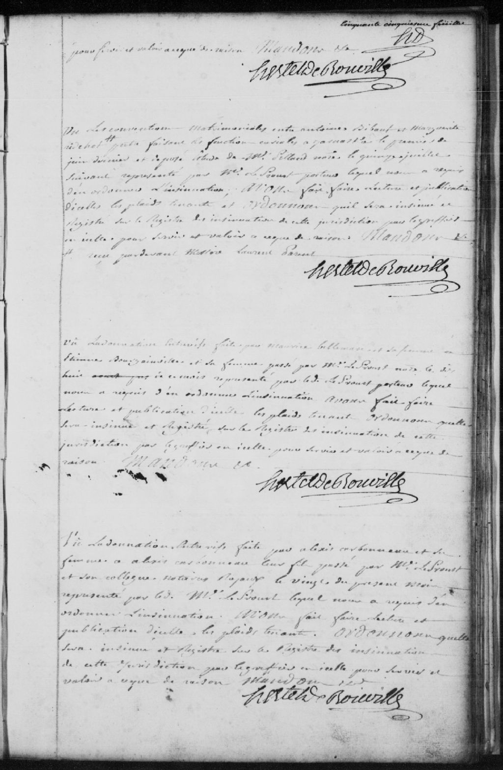Lecture et publication d’une donation entre vifs faite par Maurice Bellemare et sa femme, à Etienne Bourgainville et sa femme, passée par maître LeProust (Leprou, Prou, Proulx), notaire ; il est ordonné qu’elle soit insinuée et registrée par le greffier de la Juridiction des Trois-Rivières sur le registre des insinuations pour servir et valoir en justice