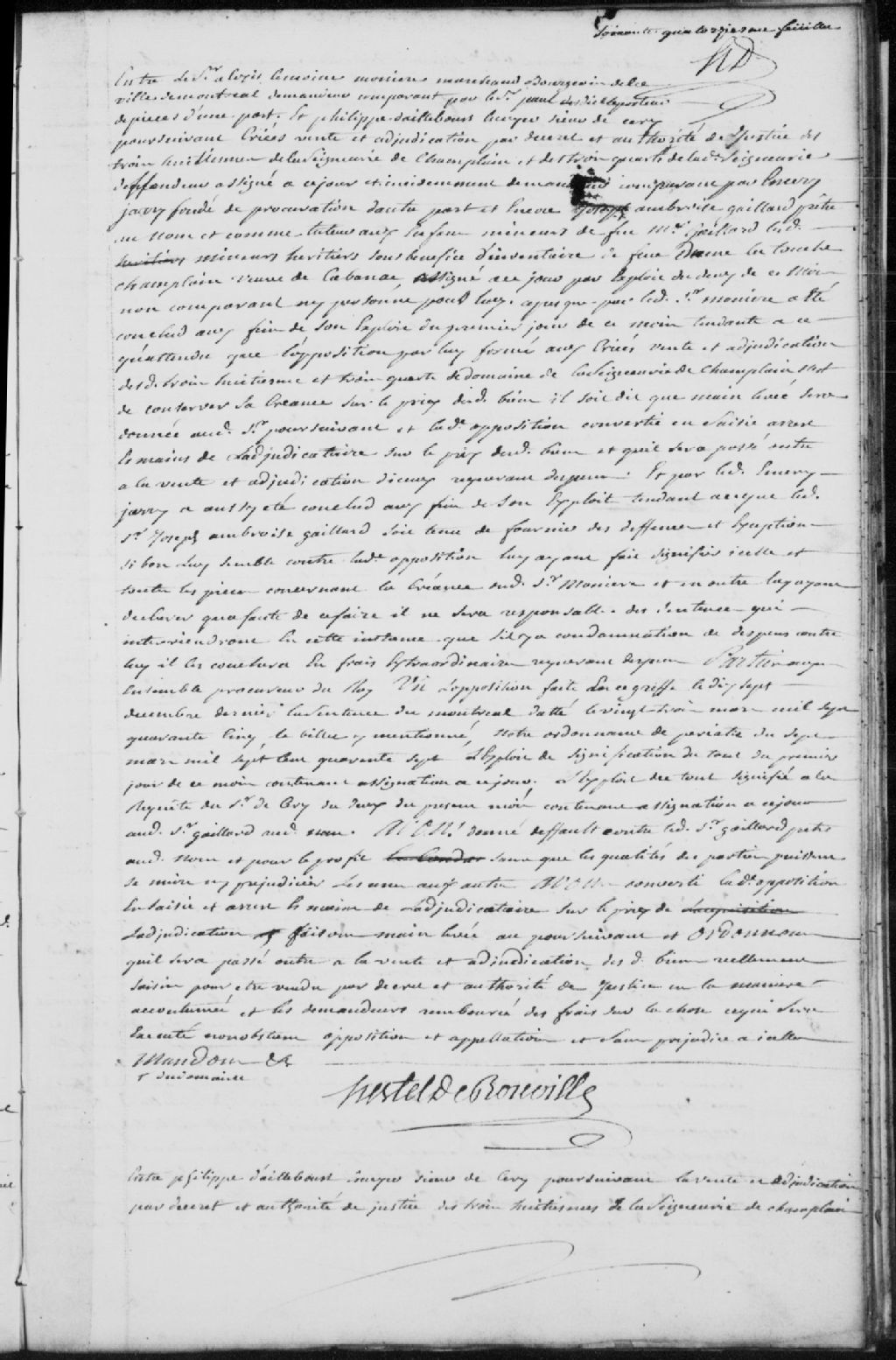 - Le titre complet de la pièce se lit comme suit : Défaut à Philippe d¿Ailleboust (Dailleboust), écuyer, sieur de Cery (Cerry), poursuivant les criées, vente et djudication par décret et autorité de justice des trois huitièmes de la seigneurie de Champlain et des trois quarts du domaine de la seigneurie, demandeur, comparant par Emery Jarry, son procureur spécial, contre Joseph Ambroise Gaillard, en tant que tuteur des enfants mineurs de feu monsieur Gaillard, son frère, qui sont héritiers sous bénéfice d¿inventaire de feue la dame Latouche Champlain, veuve de Cabanac, défendeur et défaillant, pour que ledit Gaillard comparaisse à propos du certificat des criées et que la sentence soit rendue sur celles-ci; la Cour commet le sieur LeBoulanger (Leboulanger, Boulanger), procureur fiscal du Cap-de-la-Madeleine, et maître Joseph Rouillard, notaire royal de la Juridiction des Trois-Rivières, qui déclarent que les criées sont bonnes, valables et bien faites; la saisie et les criées sont déclarées bonnes, valables et faites selon les us et coutumes de la prévôté et vicomté de Paris suivies en Nouvelle-France pour servir et valoir en justice.