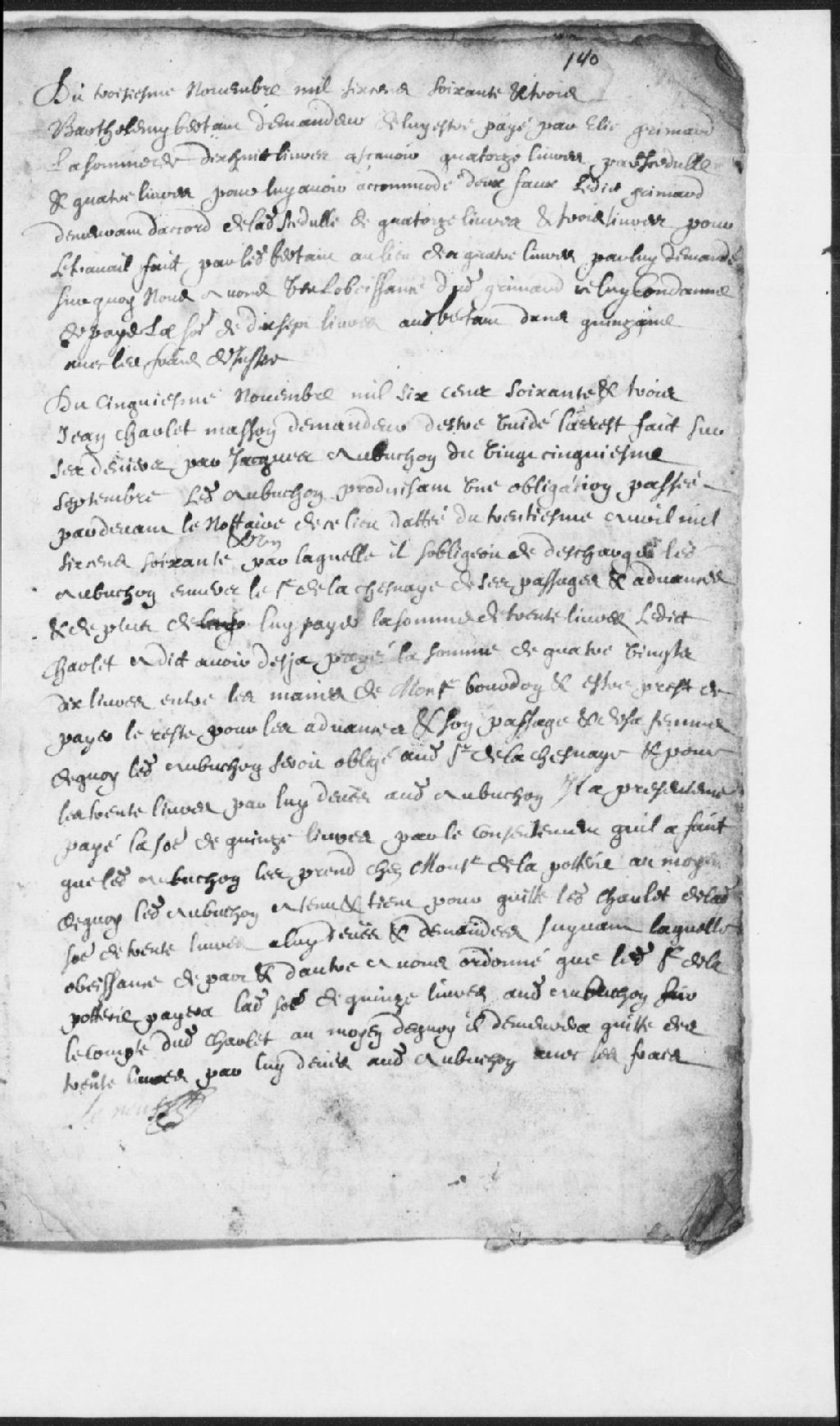Requête de Barthélemy Bertaut (Bertault), demandeur, contre Élie Grimard, pour qu'il lui paye la somme de 18 livres dont 14 livres pour une cédule et 4 livres pour lui avoir accordé deux faux, lequel conteste en partie disant ne vouloir payer que 3 livres pour le travail fait audit Bertaut. Parties d'accord. Ordonné audit Grimard de payer la somme de 17 livres dans quinzaine avec les frais