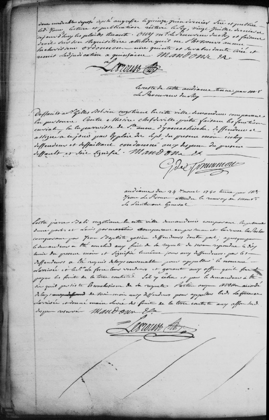 Défaut à Gilles Bolvin, négociant à Trois-Rivières, demandeur, contre messire Chefdeville, prêtre faisant les fonctions curiales en la paroisse de Sainte-Anne-d’Yamachiche, défendeur et défaillant; ce dernier est condamné aux dépens et à être signifié