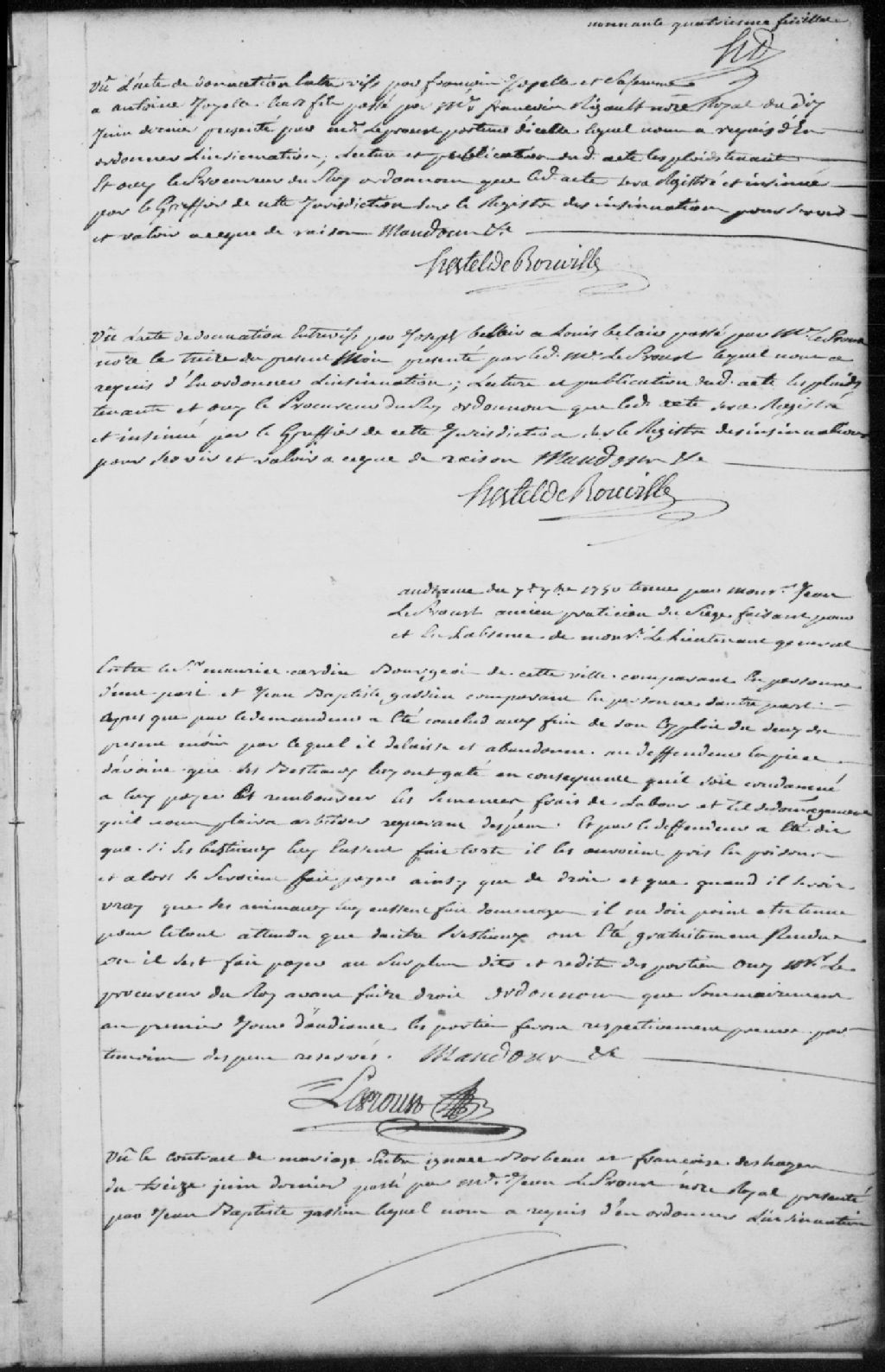 Lecture et publication d’un acte de donation entre vifs fait par Joseph Belair (Bélair) à Louis Belair, passé par maître LeProust (Leprou, Prou, Proulx), notaire, le 13 août 1750, et présenté par maître LeProust; il est ordonné qu’il soit insinué et registré par le greffier de la Juridiction des Trois-Rivières sur le registre des insinuations