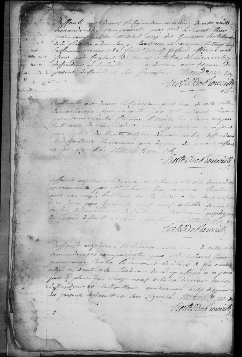 Défaut accordé aux Dames Religieuses Ursulines des Trois-Rivières, comparant par maître LeProust (Leprou, Prou, Proulx), notaire royal, contre la veuve et les héritiers de feu Charles Augé (Auger), demeurant à la Rivière-du-Loup, défendeur et défaillant, ledit défaillant est condamné aux dépens du défaut