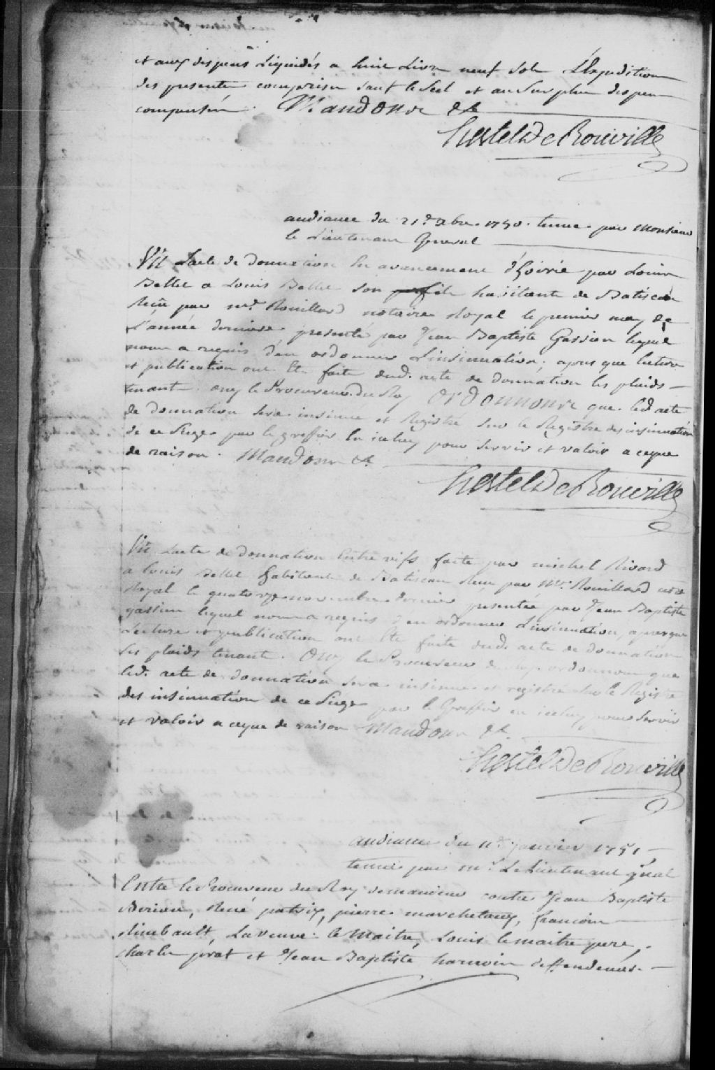 Lecture et publication d’un acte de donation en avancement d’hoirie fait par Louis Bellet à Louis Bellet, son fils, habitant demeurant à Batiscan, reçu par maître Rouillard, notaire royal, présenté par Jean-Baptiste Gassien (Gatien), lequel en a requis l’insinuation. Il est ordonné que l’acte de donation soit insinué et registré sur le registre des insinuations du siège des Trois-Rivières