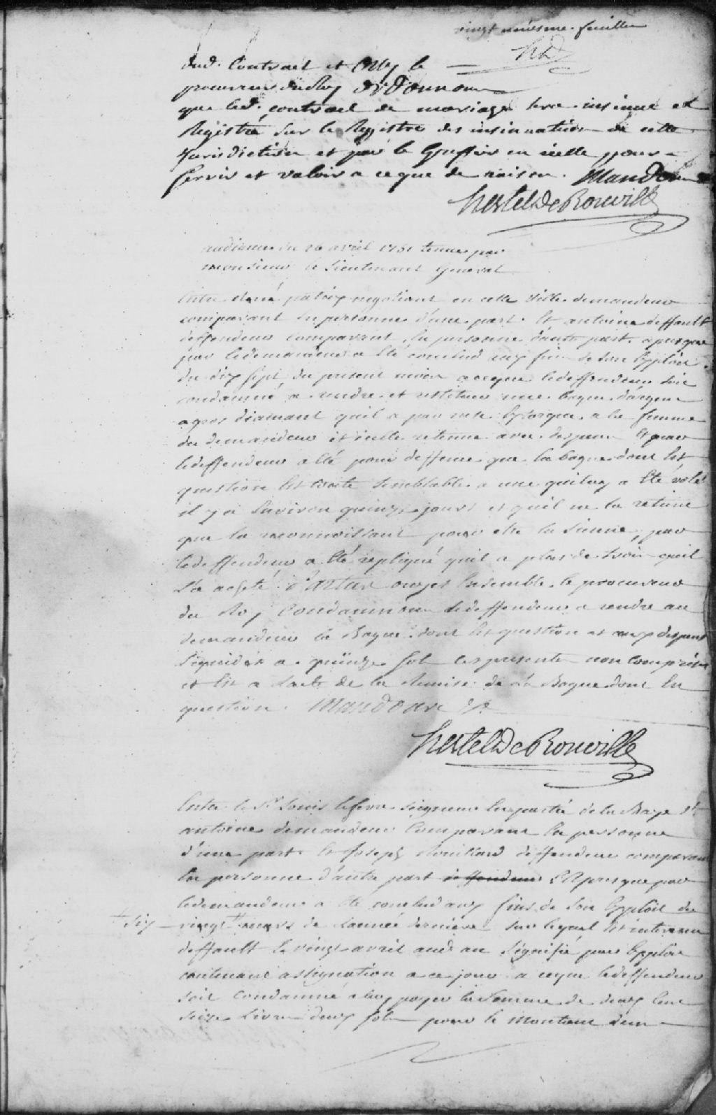 Requête de René Patrix (Patry), demandeur, contre Antoine Duffault (Dufault), défendeur. Le demandeur requiert que le défendeur lui rende une bague en argent à gros diamant qu’il a pris par ruse à sa femme. Le défendeur a répliqué que la bague ressemble étrangement à celle qu’il s’est fait volé il y a deux semaines et qu’il la retient parce qu’il la reconnait comme étant la sienne. La Cour condamne le défendeur à restituer la bague au demandeur et aux dépens taxés à 15 sols