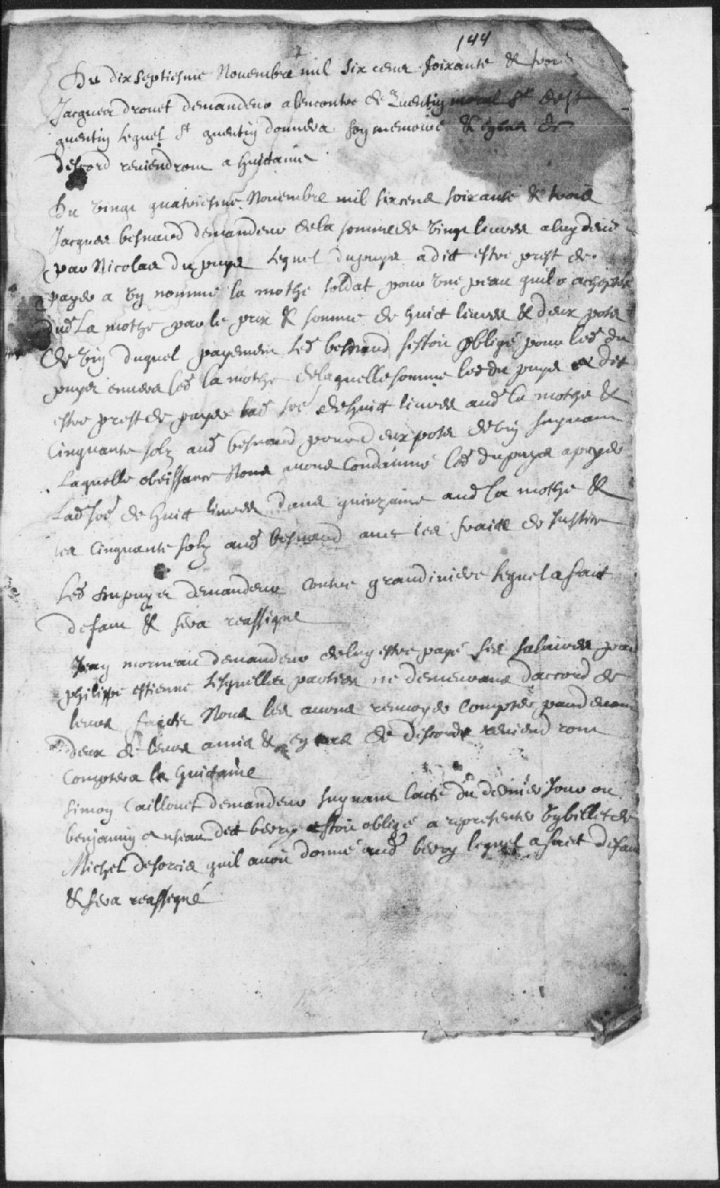 Requête de Jacques Besnard (Bénard), demandeur, contre Nicolas du Puys (Dupuy) pour la somme de 20 livres, lequel affirme être prêt à payer à un certain la Mothe (Lamotte - Lamothe), soldat, la somme de 8 livres et 2 pots de vin pour une peau et la somme de 50 sols pour 10 pots de vin audit Besnard. Ordonné audit du Puys de payer audit la Mothe la somme de 8 livres dans quinzaine et audit Besnard la somme de 50 sols avec les frais de justice