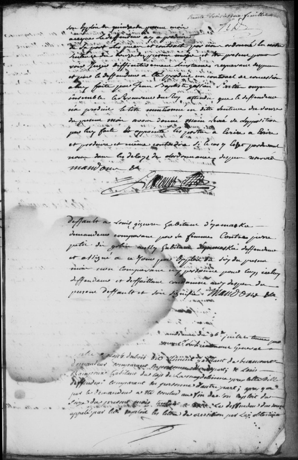 - Le titre complet de la pièce se lit comme suit : Requête de Joseph Dubois dit Clément, habitant de Bécancour, demandeur, contre Louis Champoux, habitant du Cap-de-la-Madeleine, défendeur. Le demandeur requiert que les lettres de rescision qu¿il a obtenues le 28 juin dernier soient entérinées et que les parties soient remises en même état qu¿elles étaient avant la passation de l¿acte en forme de transaction passé entre les parties devant maître Pillard, notaire. La Cour a entériné les lettres de rescision et remet les parties dans l¿état qu¿elles étaient avant la passation de l¿acte, à la charge du demandeur d¿entretenir les charges et clauses mentionnées dans l¿acte de donation entre vifs qui lui a été fait par ledit Champoux le 14 juillet 1732, sans dépens.