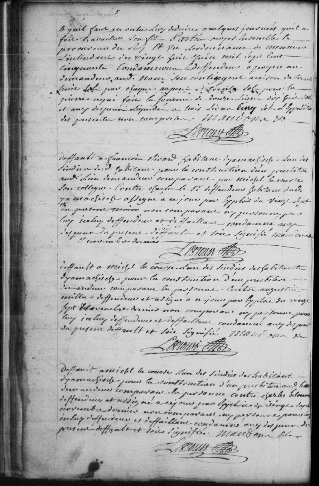Défaut à Michel la Course (Lacourse), l'un des syndics des habitants de Yamachiche pour la construction d'un presbytère, demandeur, contre Augustin Millet (Milet), défendeur et défaillant; lequel est condamné aux dépens du présent défaut et à être signifié