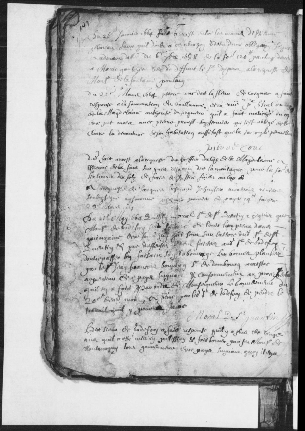 Réponse de Pierre Couc dit la Fleur (Lafleur) de Cognac à la sommation de Guillaume de la Rue (Larue), procureur fiscal du Cap-de-la-Madeleine, qui a fait marché avec Pierre Proust, son fermier, qui devra clore la devanture de son habitation dès que la saison le permettra, 22 mars 1664, Archives nationales à Trois-Rivières, Fonds Juridiction royale des Trois-Rivières, (04T,TL3,S11,P439).