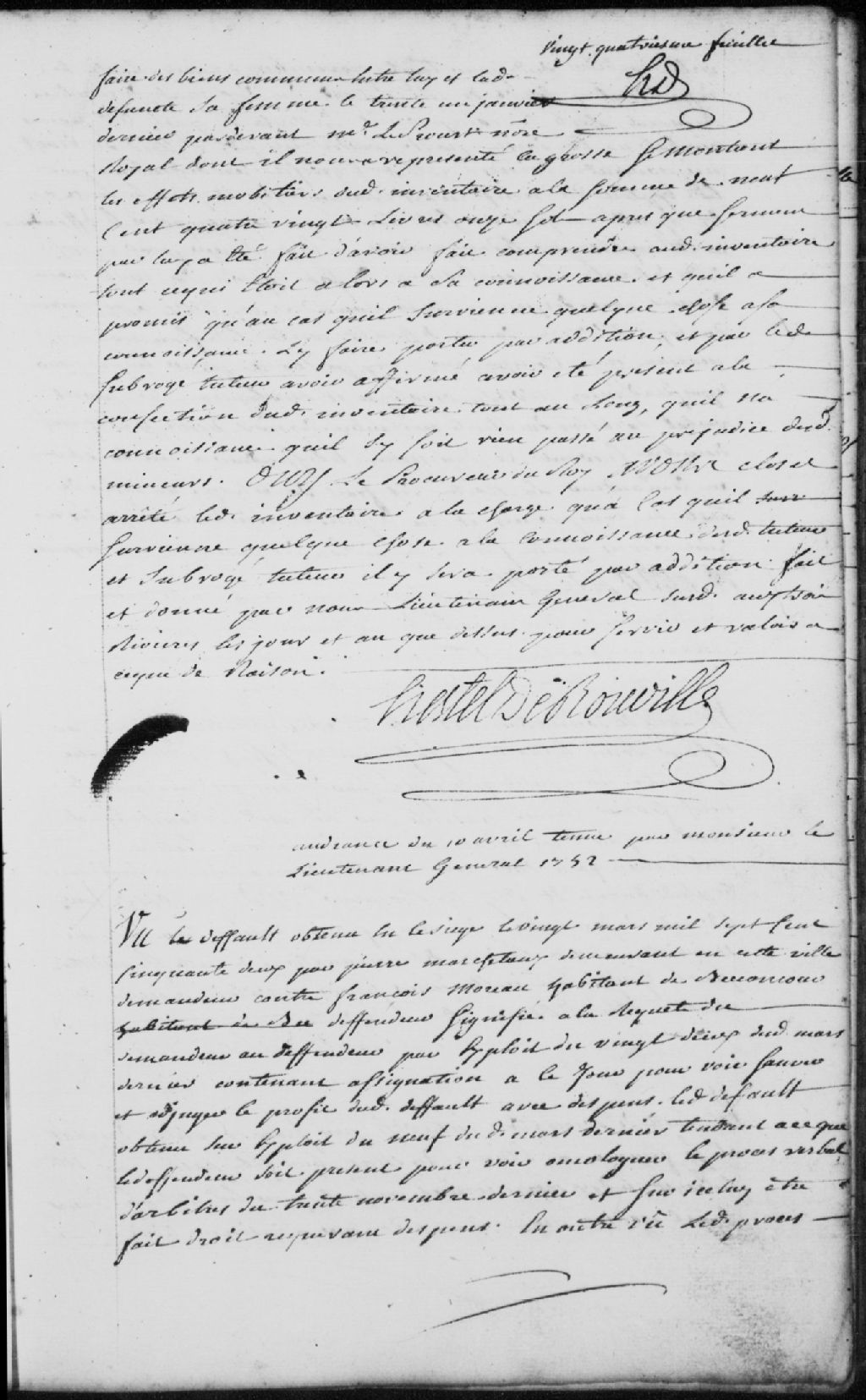 Défaut accordé à Pierre Marchetaux (Marcheteau), demeurant à Trois-Rivières, demandeur, contre François Moreau, habitant de Bécancour, défendeur..., 10 avril 1752, Archives nationales à Trois-Rivières, Fonds Juridiction royale des Trois-Rivières, (04T,TL3,S11,P4394).