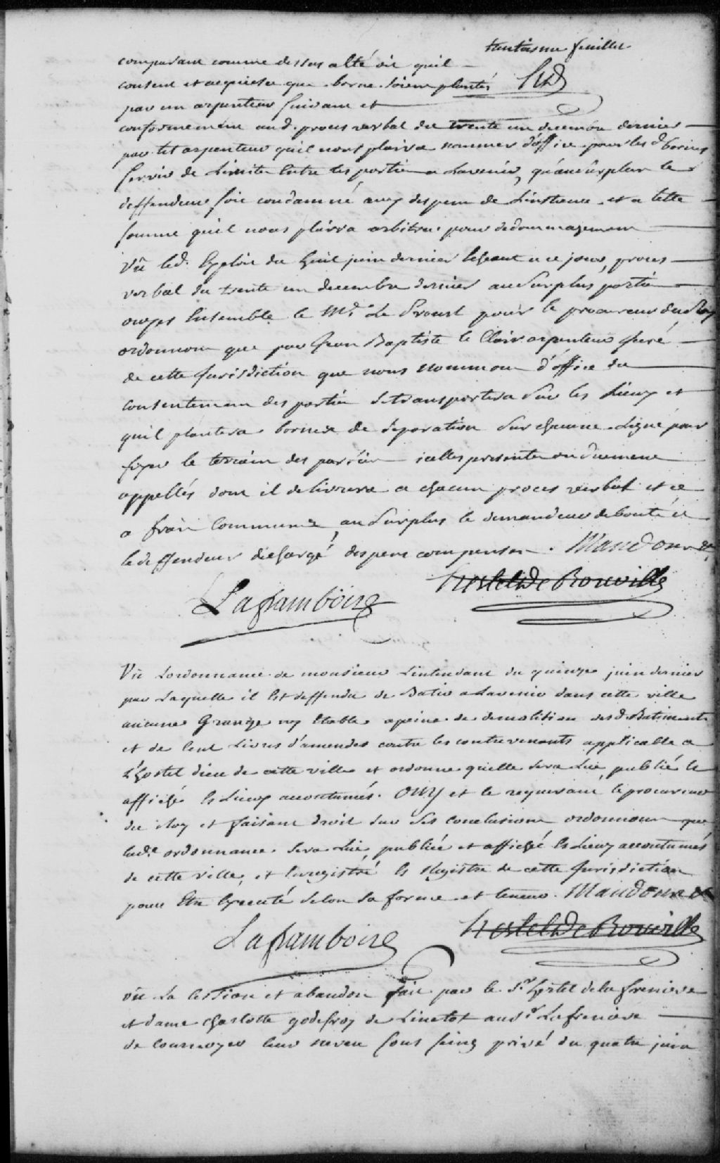Ordonnance de monsieur l'intendant du 15 juin 1752, laquelle fait défense de bâtir dans la ville de Trois-Rivières des granges et étables sous peine de démolition et de 100 livres d'amende applicable à l'Hôtel-Dieu de la ville des Trois-Rivières; la Cour ordonne qu'elle soit lue, publiée et affichée en lieux accoutumés et enregistrée sur le registre de la Juridiction des Trois-Rivières pour être exécutée selon sa forme et teneur