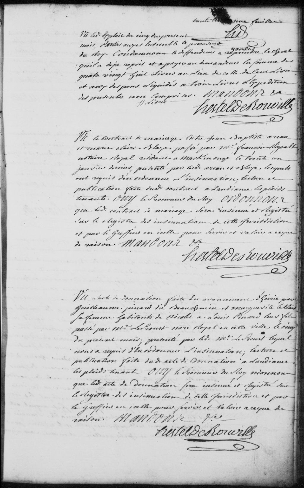 Lecture et publication de l'acte de donation fait en avancement d'hoiries par Guillaume Pinard dit Beauchemin et Marguerite Leclair (Leclerc), sa femme, habitants de Nicolet, à Louis Pinard, leur fils, passé et présenté par maître Leproust (Le Proust, Prou, Proulx), notaire royal en la Juridiction des Trois-Rivières, le 5 août 1752; la Cour ordonne que l'acte de donation soit insinué et enregistré sur le registre des insinuations de la Juridiction des Trois-Rivières