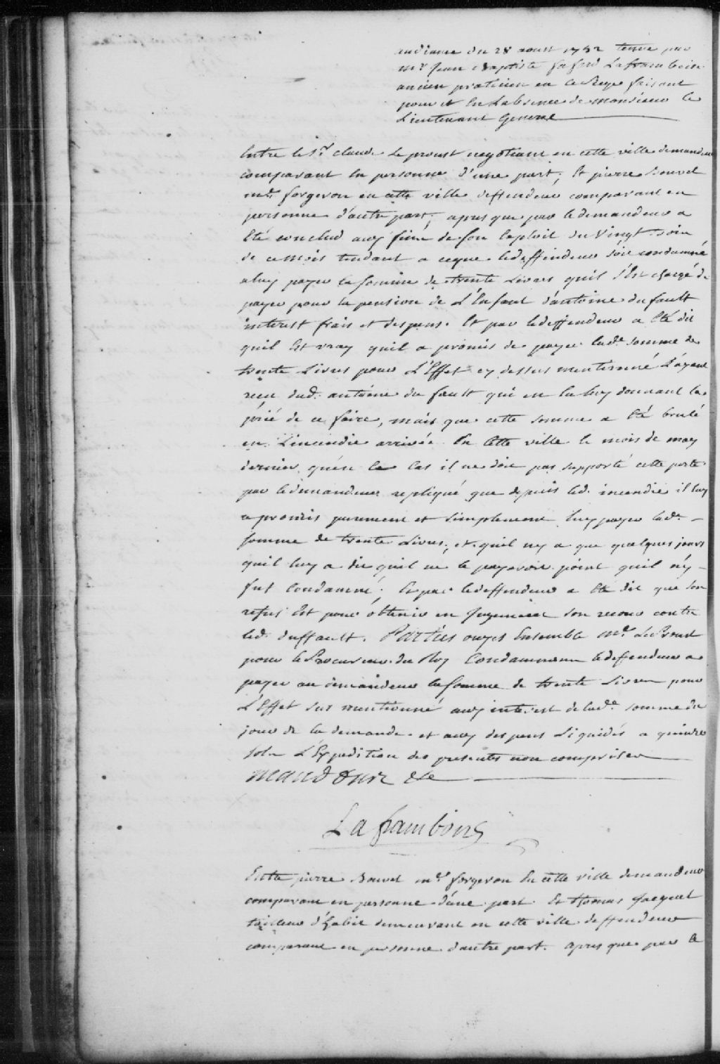 Requête entre Pierre Bouvet, maître forgeron en la ville de Trois-Rivières, demandeur, contre Thomas Jacques, tailleur d'habits demeurant à Trois-Rivières, défendeur, pour la somme de 12 livres; le défendeur avoue devoir la somme et requiert un délai pour payer; le défendeur est condamné à payer au demandeur la somme de 12 livres, aux intérêts de la somme, frais et dépens liquidés à 15 sols, 28 août 1752, Archives nationales à Trois-Rivières, Fonds Juridiction royale des Trois-Rivières, (04T,TL3,S11,P4430).
