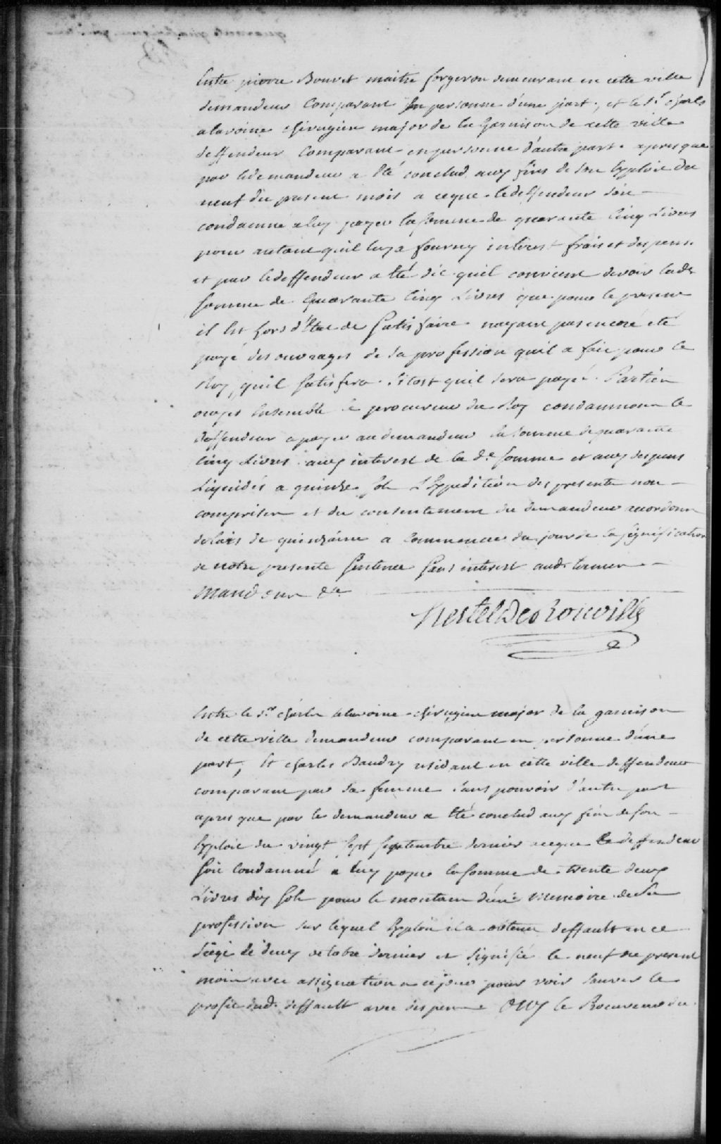- Le titre complet de la pièce se lit comme suit : Défaut accordé à Charles Alavoine, chirurgien-major de la garnison de Trois-Rivières, demandeur, contre Charles Baudry (Beaudry), résidant des Trois-Rivières, défendeur comparant par sa femme, sans pouvoir, pour la somme de 32 livres et 10 sols pour le montant d'un mémoire de sa profession sur lequel exploit il a obtenu défaut et pour voir sauver et adjuger le profit du défaut avec dépens; le défendeur est condamné à payer au demandeur la somme de 32 livres et 10 sols pour le montant du mémoire aux intérêts de la somme du jour de la demande et aux dépens liquidés à 47 sols.