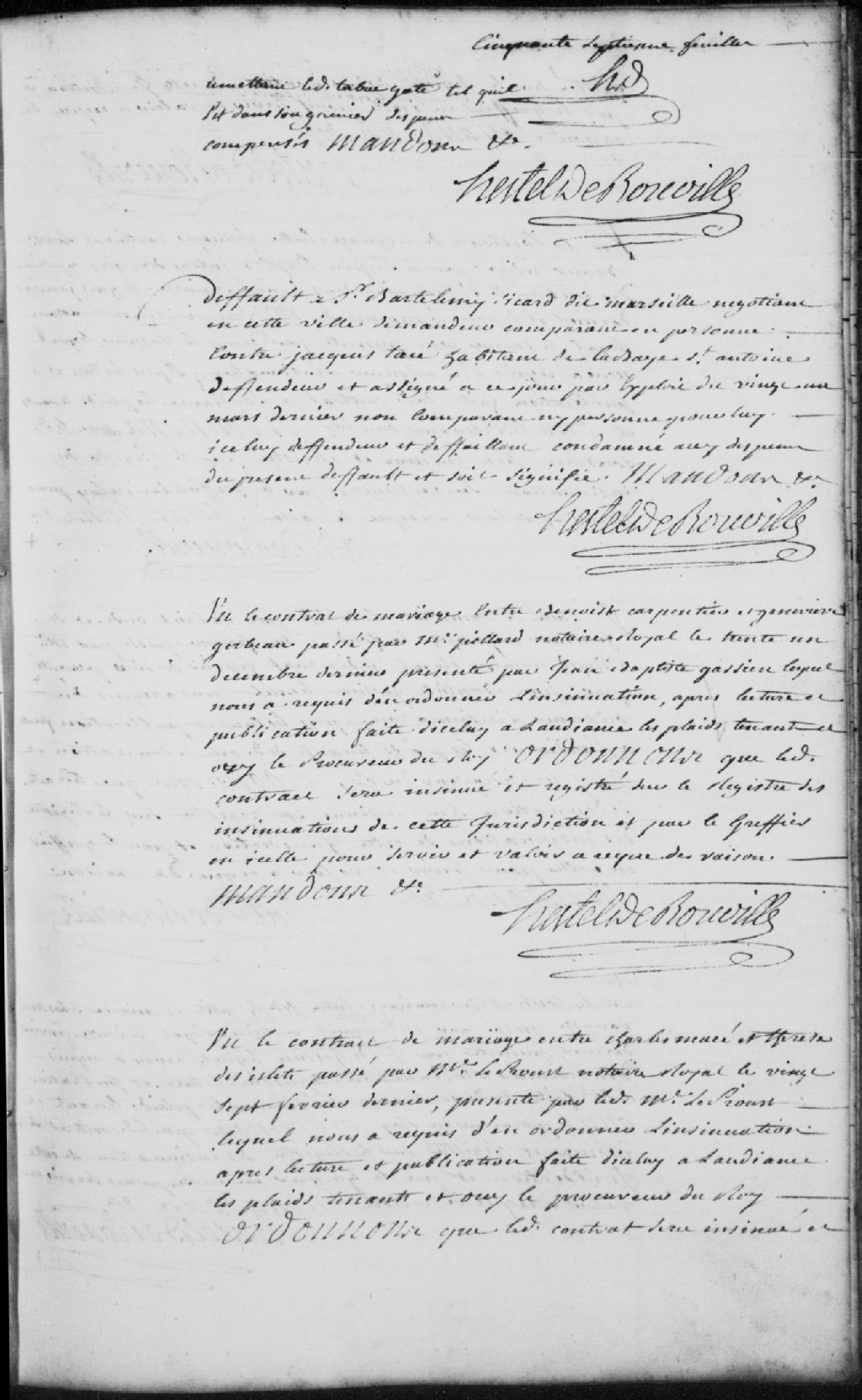 Lecture et publication du contrat de mariage entre Charles Macé (Massé) et Thérèse Des Islets (Désilets) passé par-devant maître Le Proust (Leproust, Prou, Proulx), notaire royal, le 27 février 1753, lequel a aussi présenté le contrat; la Cour ordonne que le contrat de mariage soit insinué et enregistré sur le registre des insinuations, 2 avril 1753, Archives nationales à Trois-Rivières, Fonds Juridiction royale des Trois-Rivières, (04T,TL3,S11,P4494).