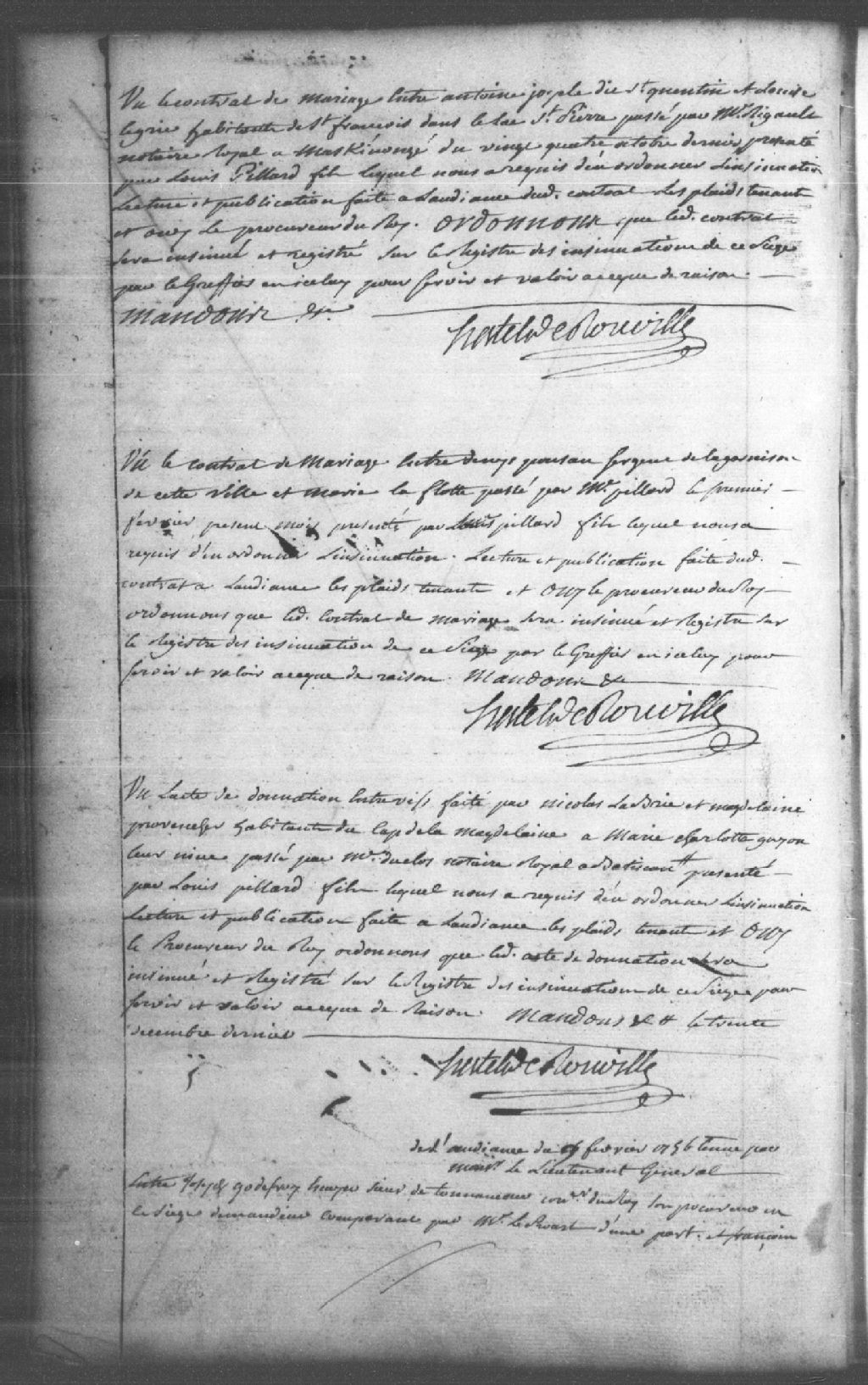 Lecture et publication d’un contrat de mariage entre Antoine Joyele (Joyel, Joyal) dit Saint-Quentin (Saint-Cantin) et Louise Legris, habitants de Saint-François dans le lac Saint-Pierre passé par maître Rigault (Rigaud), notaire royal à Maskinongé, du 24 octobre dernier et présenté par Louis Pillard fils; la Cour ordonne qu’il soit insinué et registré par le greffier de la Juridiction des Trois-Rivières sur le registre des insinuations pour servir et valoir en justice