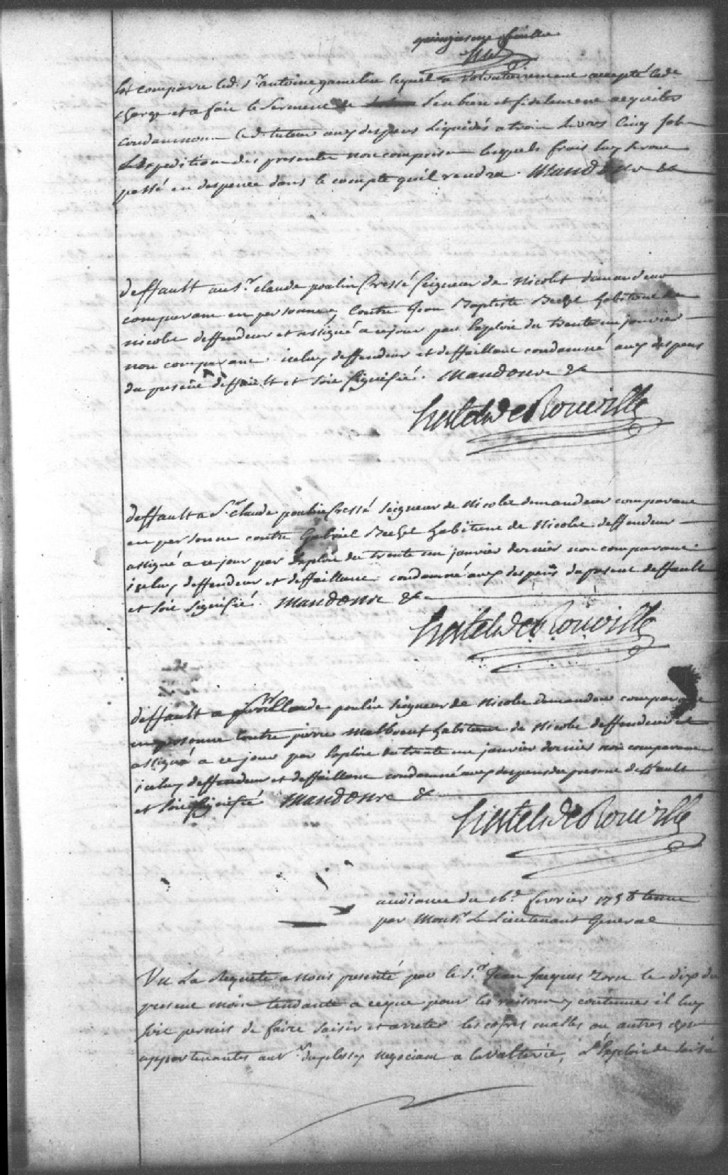 Défaut au sieur Claude Poulin Cressé, seigneur de Nicolet, demandeur, contre Gabriel Bechet, habitant de Nicolet, défendeur et défaillant; ce dernier est condamné aux dépens et à être signifié