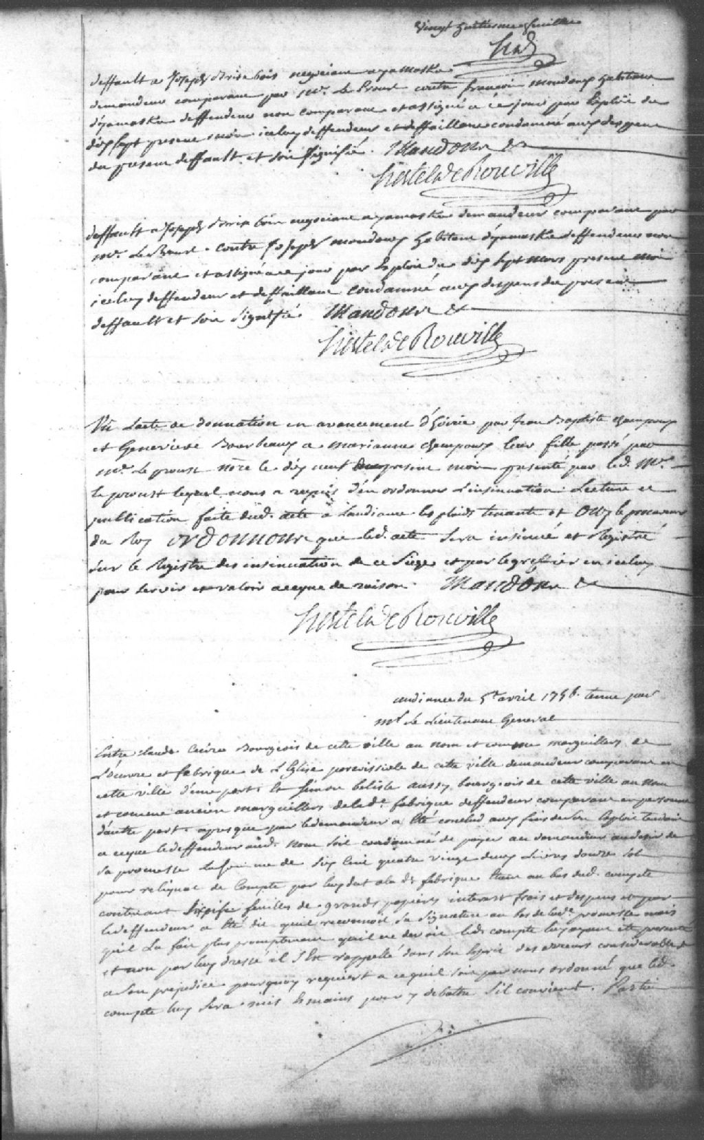 - Le titre complet de la pièce se lit comme suit : Requête de Claude Cecire, bourgeois de Trois-Rivières, en tant que marguilliers de l¿oeuvre et fabrique de l¿église paroissiale de Trois-Rivières, demandeur, contre Simon Belisle, bourgeois de Trois-Rivières, en tant qu¿ancien marguillier de la fabrique, défendeur, pour que ce dernier soit condamné à payer au demandeur selon sa promesse la somme de 682 livres et 12 sols pour reliquat de compte qu¿il doit à la fabrique avec les intérêts et frais; le défendeur reconnaît sa signature, mais il requiert que le compte lui soit mis en ses mains pour en débattre; la Cour ordonne que le contenant de 3 feuillets de papier qui contient la promesse restera dans les mains du greffier pour être remis au défendeur sur son récépissé et s¿il ne remet par le compte, il sera condamné à payer au demandeur la somme de 682 livres et 12 sols, aux intérêts et aux dépens liquidés à 18 sols, sinon il débattra le compte au premier jour d¿audience; dépens réservés.
