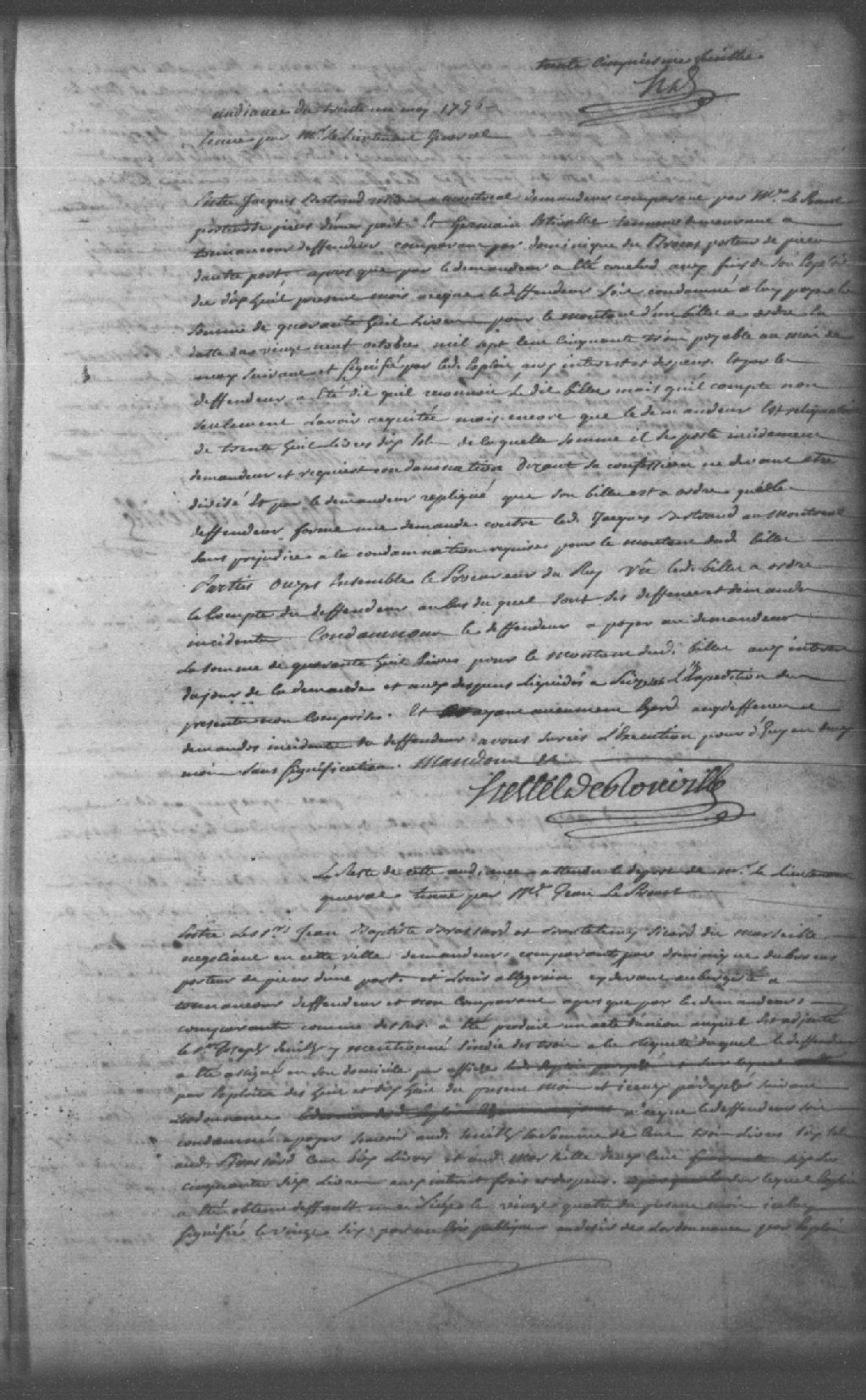 Le titre complet de la pièce se lit comme suit : Requête de Jacques Bertrand, résidant à Montréal, demandeur comparant par maître LeProust (Leprou, Prou, Proulx), porteur de pièces, contre Germain Estivallet (Estivalet), tanneur demeurant à Tonnancour, défendeur comparant par Dominique DuBrocas (Dubroca), porteur de pièces, pour que le défendeur soit condamné à payer au demandeur la somme de 48 livres pour le montant d¿un billet à ordre daté du 29 octobre 1753 payable au mois de mai suivant; le défendeur répond qu¿il a acquitté la somme et même que le demandeur lui doit 38 livres et 10 sols; le défendeur est condamné à payer au demandeur la somme de 48 livres pour le montant du billet, aux intérêts et aux dépens liquidés à 16 sols; l¿exécution est sursise pour 2 mois.