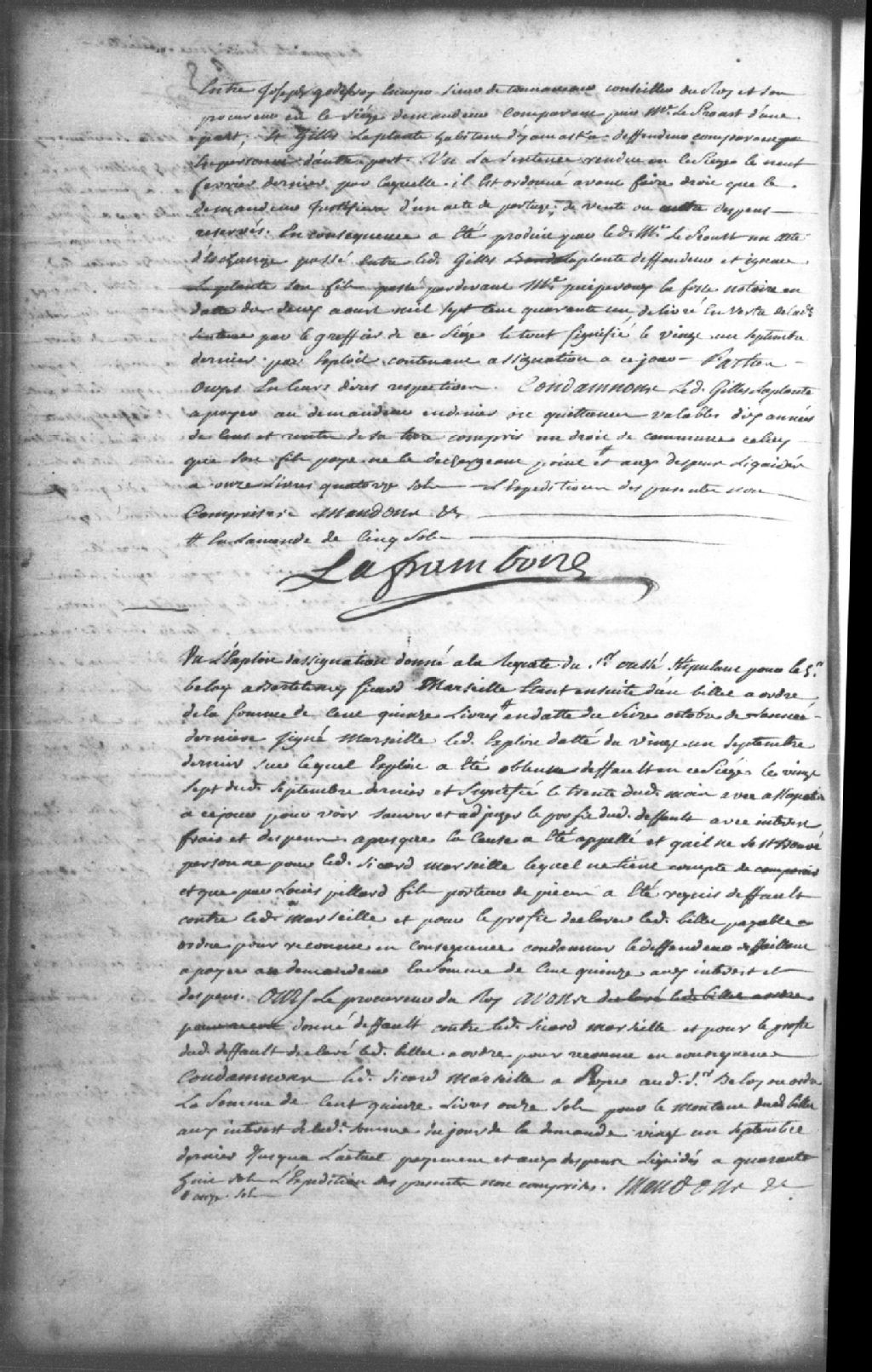 Le titre complet de la pièce se lit comme suit : Instance entre Joseph Godefroy, écuyer sieur de Tonnancour, conseiller et procureur du Roi au siège des Trois-Rivières, demandeur comparant par maître Jean LeProust (Leprou, Prou, Proulx), contre Gilles Laplante, habitant d¿Yamaska, défendeur, en suite de la sentence du 9 février qui ordonne que le demandeur justifiera d¿un acte de partage, de vente ou autre; maître LeProust a produit un acte d¿échange passé entre Gilles Laplante, défendeur, et Ignace Laplante, son fils, passé par-devant maître Puiperoux (Puypéroux) LaFosse, notaire, le 2 août 1741; Gilles Laplante est condamné à payer au demandeur en deniers ou quittances valables 10 années de cens et rentes de sa terre y compris le droit de commune que son fils paie, à l¿amende de 5 sols et aux dépens liquidés à 11 livres et 14 sols.