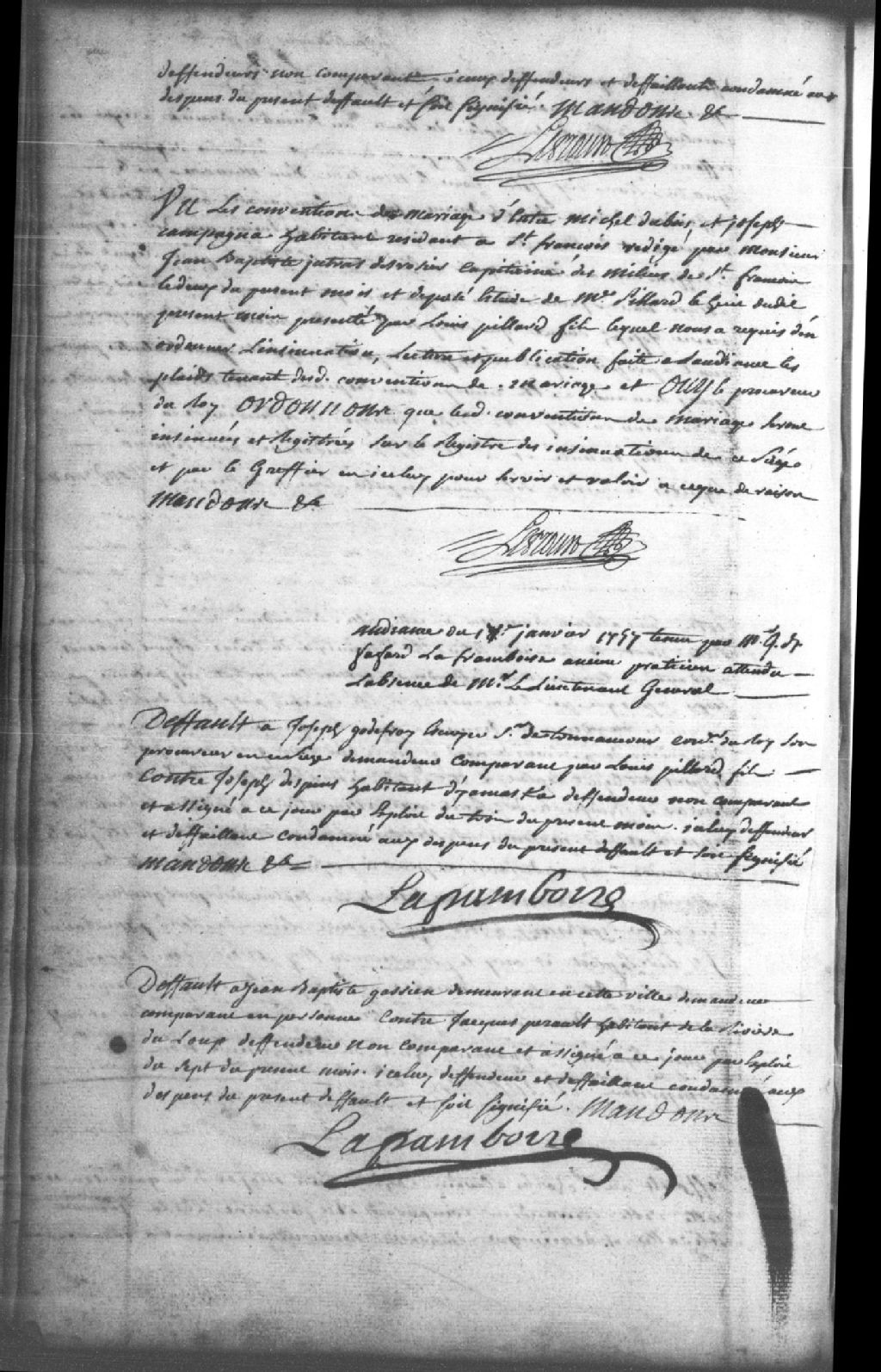 Défaut à Jean-Baptiste Gassien (Gatien), demeurant à Trois-Rivières, demandeur, contre Jacques Perault (Perrault), habitant de la Rivière-du-Loup, défendeur et défaillant; ce dernier est condamné aux dépens et à être signifié, 10 janvier 1757, Archives nationales à Trois-Rivières, Fonds Juridiction royale des Trois-Rivières, (04T,TL3,S11,P4783).