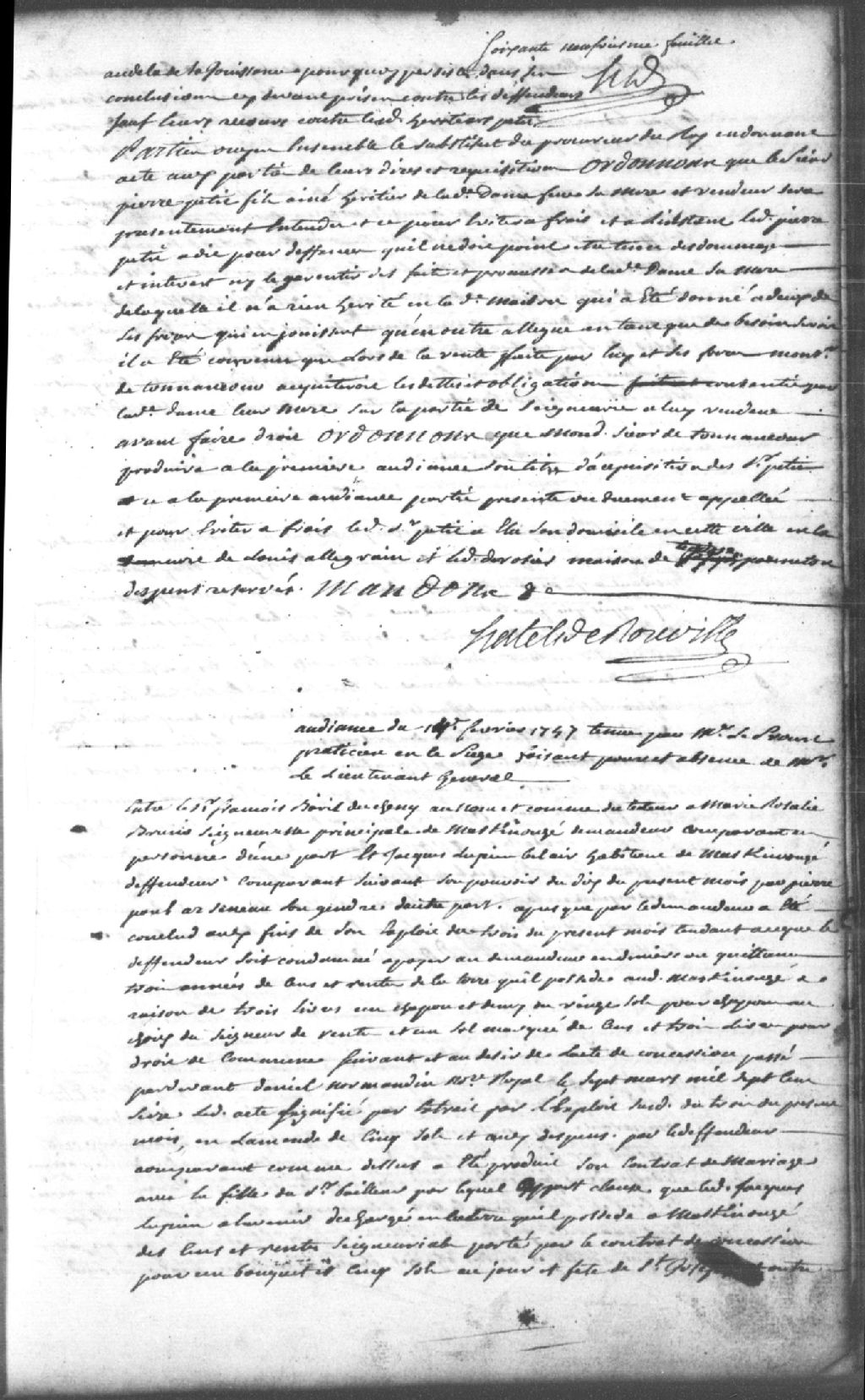 - Le titre complet de la pièce se lit comme suit : Requête du sieur François Baril Ducheny (Duchesny), en tant que tuteur de Marie-Rosalie Bruno (Bruneau), seigneuresse principale de Maskinongé, demandeur, contre Jacques Lupien dit Bélair, habitant de Maskinongé, défendeur, Pierre-Paul Arseneau (Arsenault), son gendre, pour que ce dernier soit condamné à payer au demandeur en deniers ou quittances 3 années de cens et rentes pour la terre qu¿il possède à Maskinongé pour le prix de 3 livres, 1 chapon et demi ou 20 sols par chapons au désir du seigneur et un sol marqué de cens et 3 livres pour le droit de commune; le défendeur a produit son contrat de mariage avec la fille du sieur bailleur dont il appert qu¿il est déchargé à l¿avenir des cens et rentes seigneuriales portés par son contrat de concession, et dont il reconnaît en devoir une année; le défendeur est condamné à payer au demandeur 1 année de cens et rentes selon son contrat de mariage, à l¿amende de 5 sols et aux dépens liquidés à 5 livres et 3 sols.