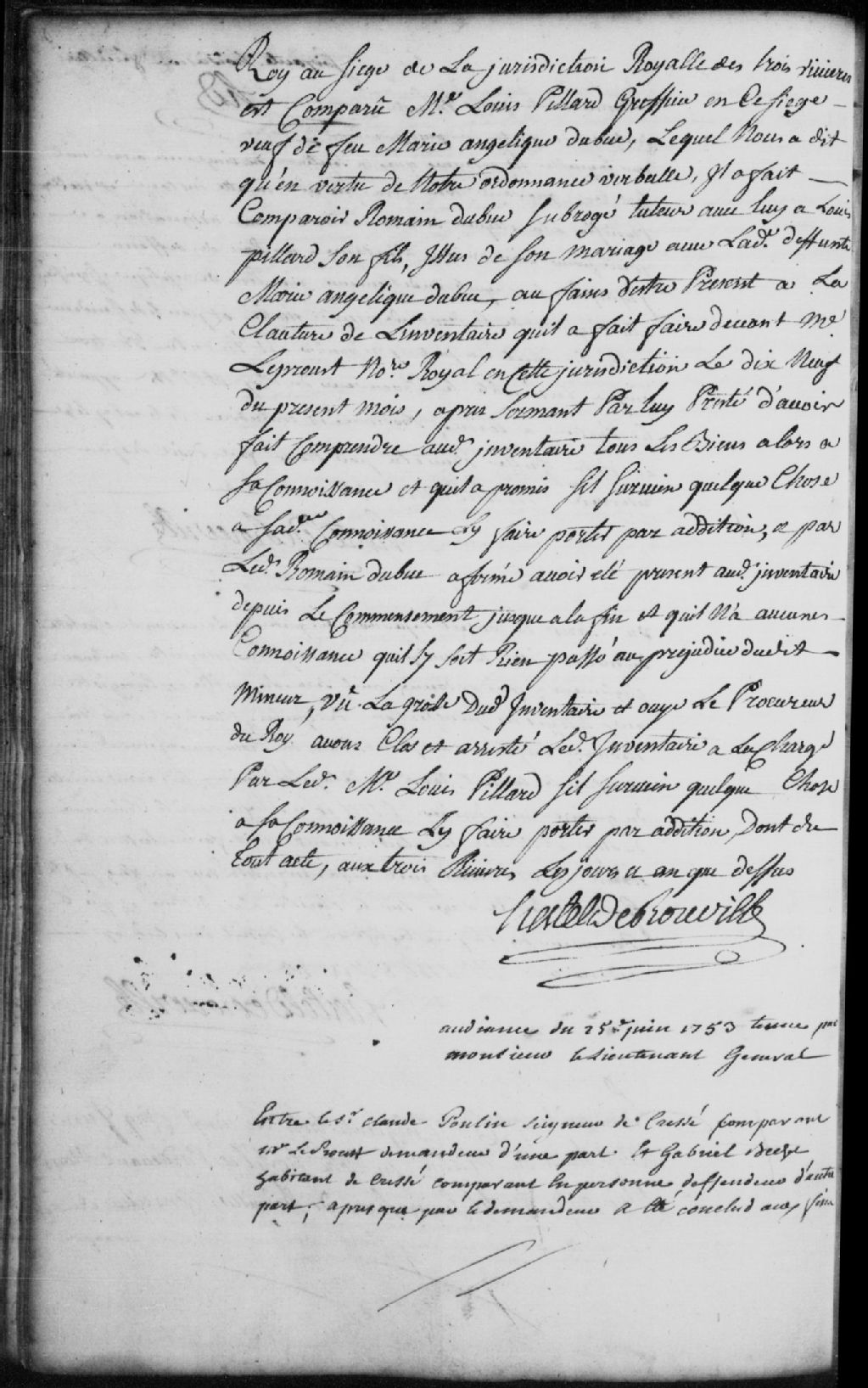 - Le titre complet de la pièce se lit comme suit : Requête du sieur Claude Poulin, seigneur de Cressé, demandeur comparant par maître Leproust, contre Gabriel Bechet, habitant de Cressé, défendeur, pour que ce dernier soit condamné à payer au demandeur une année de cens et rentes pour la terre qu¿il possède en la seigneurie du demandeur et à l¿amende suivant la coutume de Paris, et pour les cens et rentes de la terre qu¿il jouit de son fils qui est absent et à la même amende; le défendeur demande que le demandeur lui fasse une nouvelle concession de la terre de son fils puisque son fils lui avait fait un transport et cession de sa terre par-devant monsieur Cardin, alors leur curé, mais dont l¿acte est perdu; le défendeur est condamné à payer au demandeur les cens et rentes de sa terre et de celle de son fils, à l¿amende de 5 sols et aux dépens liquidés à 15 sols.