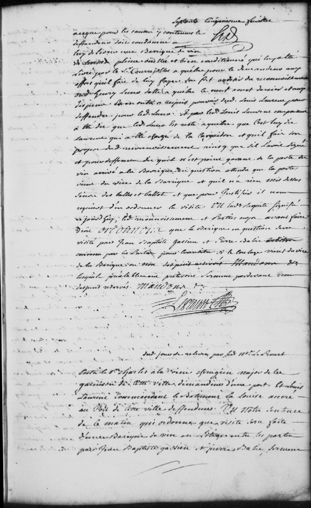 - Le titre complet de la pièce se lit comme suit : Requête du sieur Charles Alavoine, chirurgien-major de la garnison de Trois-Rivières, demandeur, contre Louis Laurent, commandant du bâtiment « La Louise » ancré au port de Trois-Rivières, défendeur, pour faire suite à la sentence du matin qui ordonne que visite soit faite d¿une barrique de vin en litige entre les parties par Jean-Baptiste Gassien (Gatien) et Pierre Babie; le rapport de ces derniers confirme que le coulage de vin provient uniquement du vice de la barrique qui n¿a pas été forcée; le demandeur est condamné à payer au défendeur le fret de ladite barrique, aux dépens liquidés à 20 livres, 5 sols et 4 deniers, et à 40 sols pour chacun des arbitres.