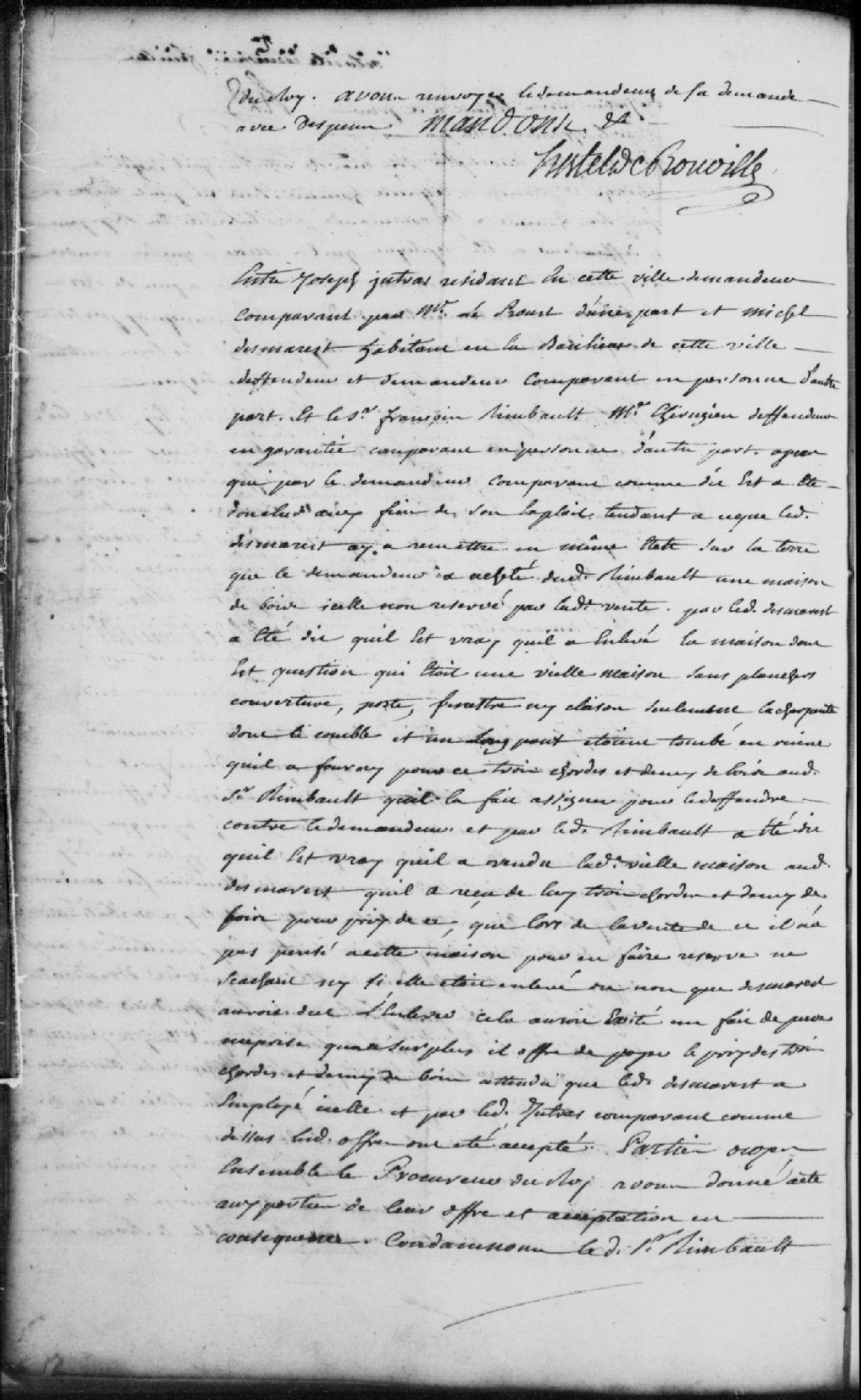 - Le titre complet de la pièce se lit comme suit : Requête Joseph Jutras, résidant à Trois-Rivières, demandeur comparant par maître Leproust, contre Michel Desmarest (Desmarais), habitant en la banlieue de Trois-Rivières, défendeur et demandeur, et le sieur François Rimbault (Raimbaud, Raimbault), maître chirurgien, défendeur en garantie, pour que ledit Desmarest ait à remettre dans le même état une maison de bois sur la terre que le demandeur a achetée dudit Rimbault; ledit Desmarest répond qu¿il a bien enlevé la maison qui était en ruine et dont il a fourni audit Rimbault 3 cordes et demi de bois; ledit Rimbault offre de rembourser au demandeur le prix des 3 cordes et demi; ce dernier est donc condamné à payer audit Jutras la somme de 21 livres pour le prix de 3 cordes et demi de bois à 6 livres la cordes, et aux dépens liquidés à 49 sols.