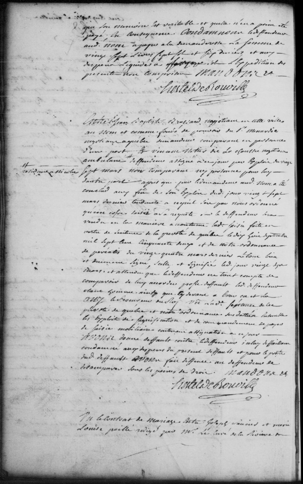 Défaut au sieur Jean-Baptiste Brassard, négociant à Trois-Rivières, en tant que fondé de pouvoir du sieur Menardie, négociant à Québec, demandeur, contre Vincent Netier dit LaChaussée, négociant ambulant résidant à Nicolet, défendeur et défaillant, pour que la Cour ordonne qu’un coffre saisie par le demandeur sur le défendeur soit rendu en la manière accoutumée; le défendeur est condamné aux dépens du défaut et la Cour lui interdit de désemparer