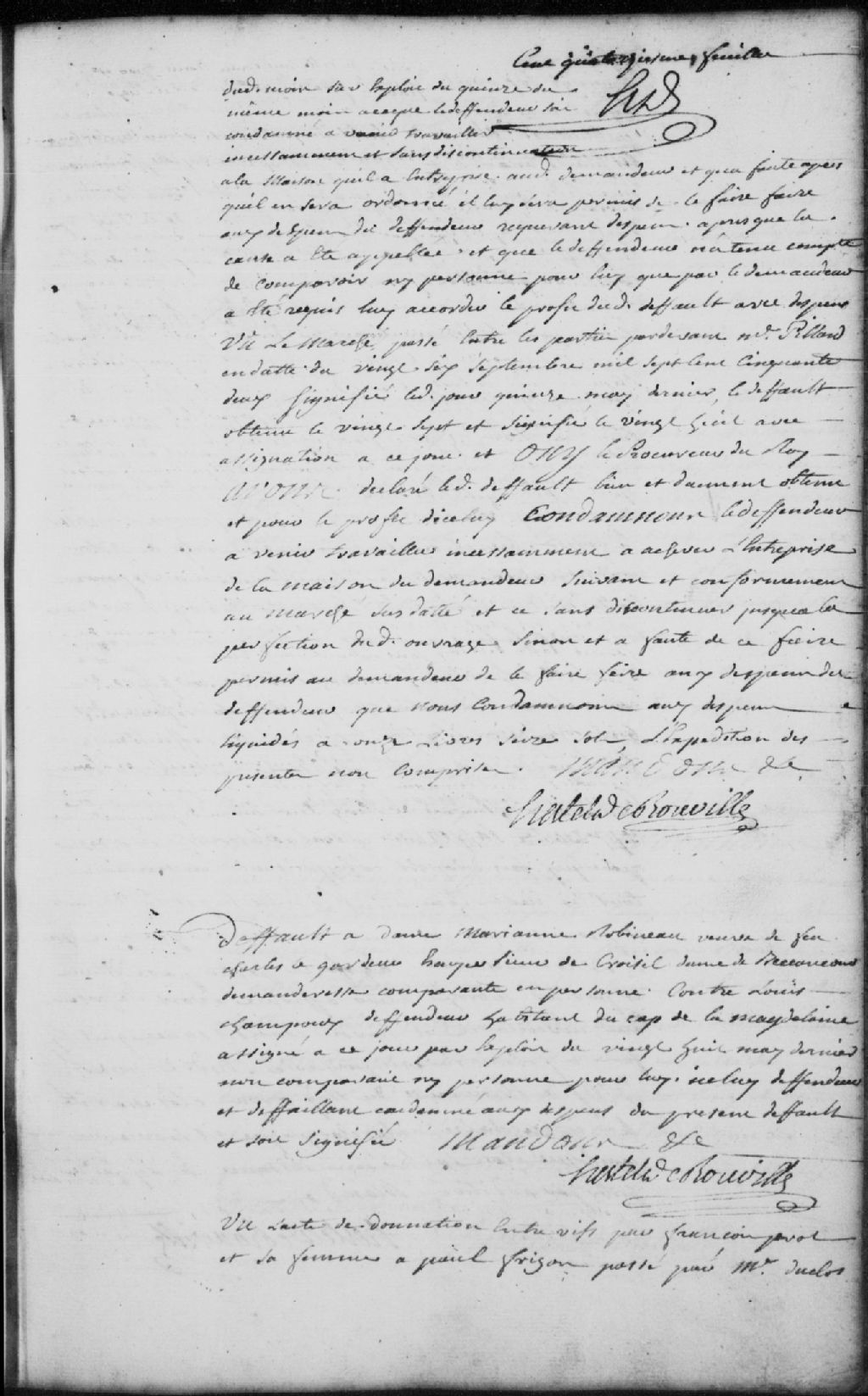 Défaut à dame Marie-Anne Robineau, veuve de feu Charles LeGardeur, écuyer sieur de Croisil (Croizille) et dame de Bécancour, demanderesse, contre Louis Champoux, habitant du Cap-de-la-Madeleine, défendeur et défaillant; ce dernier est condamné aux dépens et à être signifié