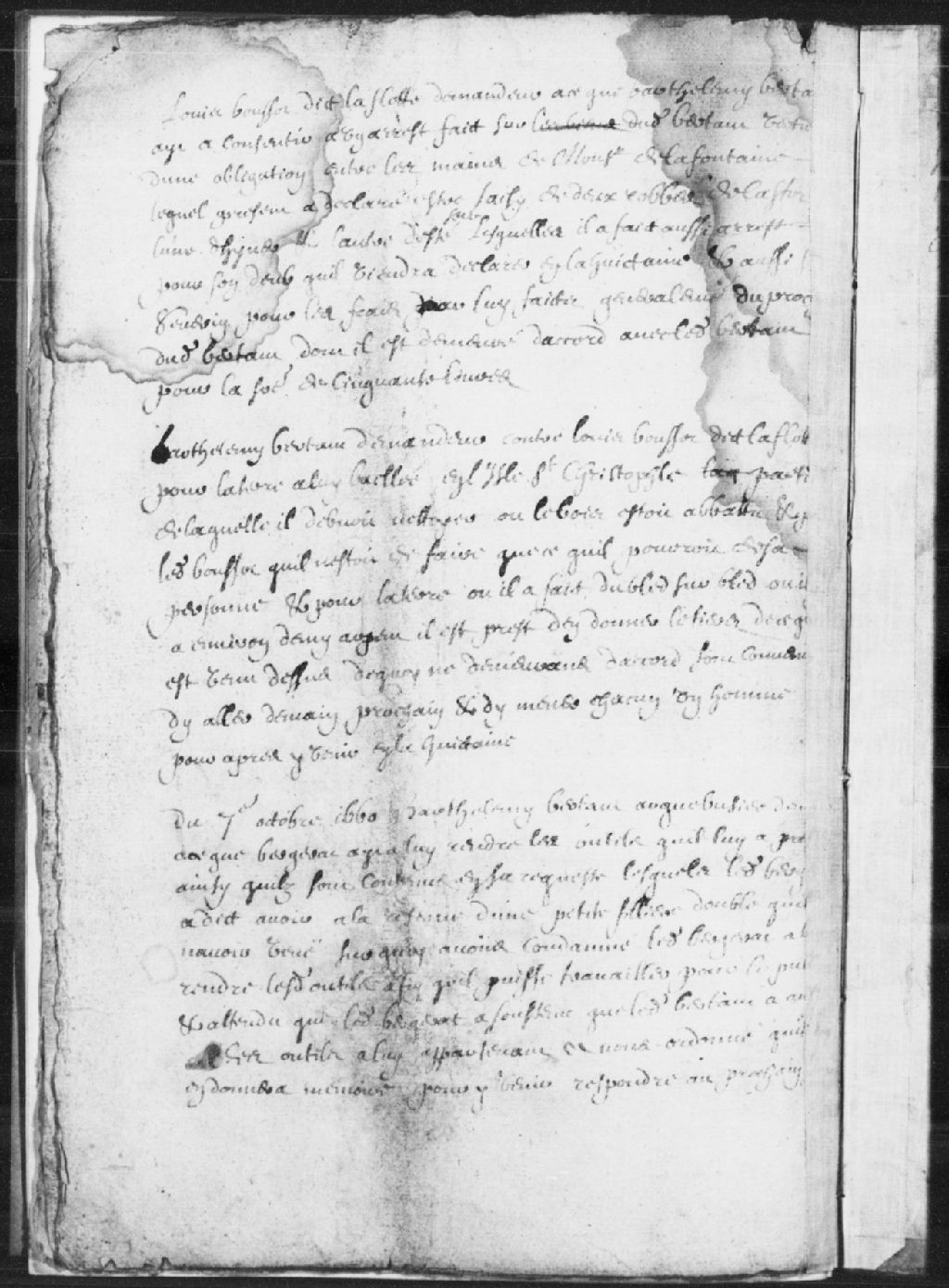 Requête de Louis Boussot dit Laflotte, demandeur, à ce que Barthélémy Bertaut (Bertault) consente à un arrêt fait sur ses biens en vertu d'une obligation entre les mains de Maurice Poulain (Poulin); lequel déclare être saisi de deux robes de castor sur lesquelles il a fait aussi arrêt pour son dû qu'il viendra déclarer en la huitaine et aussi Saint-Séverin pour les frais par lui fait généralement du procès dudit Bertaut dont il est demeuré d'accord avec ledit Bertaut pour la somme de 50 livres