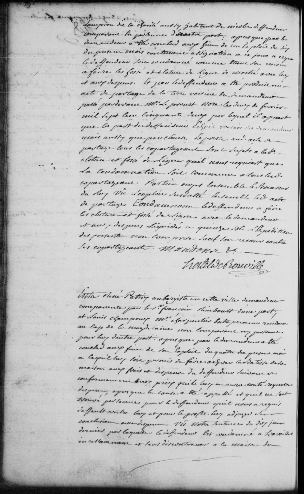 - Le titre complet de la pièce se lit comme suit : Défaut à René Patrix (Patry), aubergiste de Trois-Rivières, demandeur comparant par le sieur François Rimbault (Raimbaud, Raimbault), contre Louis Champoux, maître charpentier-entrepreneur résidant au Cap-de-la-Madeleine, défendeur et défaillant, pour qu¿il soit permis au demandeur de faire achever la bâtisse de sa maison aux frais et dépens du défendeur au prix qu¿il en aura coûté; la Cour permet au demandeur de faire achever l¿entreprise dudit Champoux à ses frais et dépens et le défendeur est condamné aux dépens du présent défaut liquidés à 3 livres.