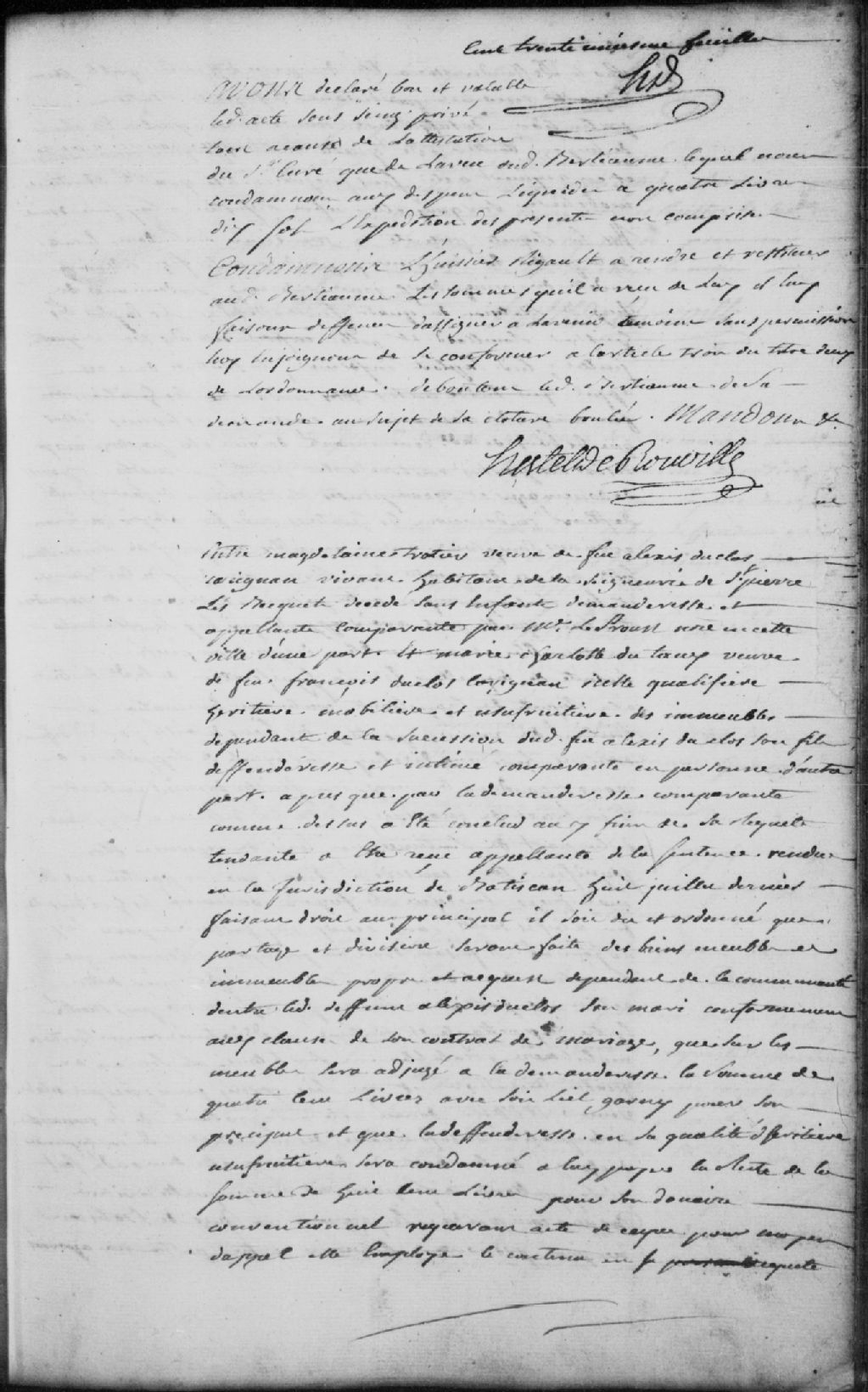 Le titre complet de la pièce se lit comme suit : Requête de Madeleine Trotier (Trottier), veuve de feu Alexis Duclos Carignan, vivant habitant de la seigneurie de Saint-Pierre-les-Becquets et décédé sans enfant, demanderesse et appelante comparant par maître Leproust, notaire à Trois-Rivières, contre Marie-Charlotte DuTaux (Duteau), veuve de feu François Duclos Carignan, qualifiée héritière mobilière et usufruitière des immeubles dépendants de la succession dudit feu Alexis Duclos, son fils, défenderesse et intimée, en suite de la sentence rendue en la Juridiction de Batiscan le 8 juillet 1754 pour qu¿il soit ordonné que le partage et la division seront faits des biens meubles et immeubles, propres et acquêts dépendant de la communauté d¿entre la demanderesse et de son défunt mari; la Cour déclare les parties mal jugées, ordonne que les inventaires seront séparés par moitié entre les parties dont 400 livres et un lit garni seront [...]