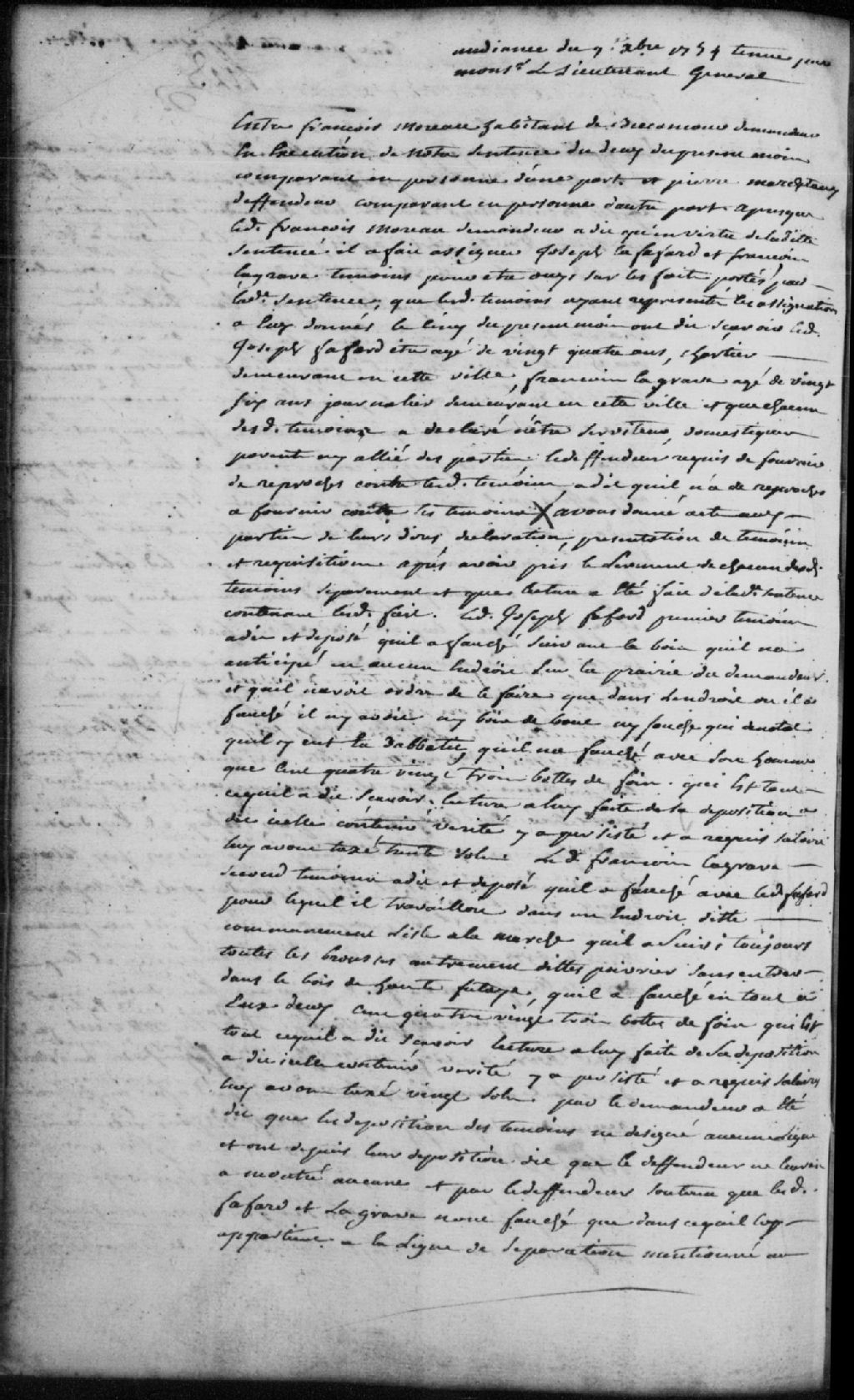 - Le titre complet de la pièce se lit comme suit : Comparution à la requête de François Moreau, habitant de Bécancour, demandeur, contre Pierre Marchetaux (Marcheteau), défendeur, faisant suite à la sentence du 2 décembre 1754 afin que comparaissent Joseph Fafard, charretier âgé de 24 ans demeurant à Trois-Rivières, et François Lagrave, journalier âgé de 26 ans demeurant à Trois-Rivières, tous deux témoins, concernant du foin fauché sur la terre du demandeur; ledit Fafard a affirmé n¿avoir fauché avec son homme que 183 bottes de foin le long du bois là où il avait eu l¿autorisation; ledit Lagrave a affirmé qu¿avec ledit Fafard, pour qui il travaillait, il a fauché au commencement de l¿Île-à-la-Marche en suivant toutes les brousses dites poivriers sans entrer dans le bois de haute futaie et qu¿il a fauché en tout 283 bottes de foins; le demandeur réplique que les témoins ont fauché plus loin que ce qu¿ils affirment et offre de le prouver; la Cour ordonne que ledit Fafard et Lagrave se transporteront sur les lieux en présence de Jean-Baptiste Lepellé LaMothe et Louis Champoux afin de montrer où est-ce qu¿ils ont fauché le foin et dont un procès-verbal sera dressé.