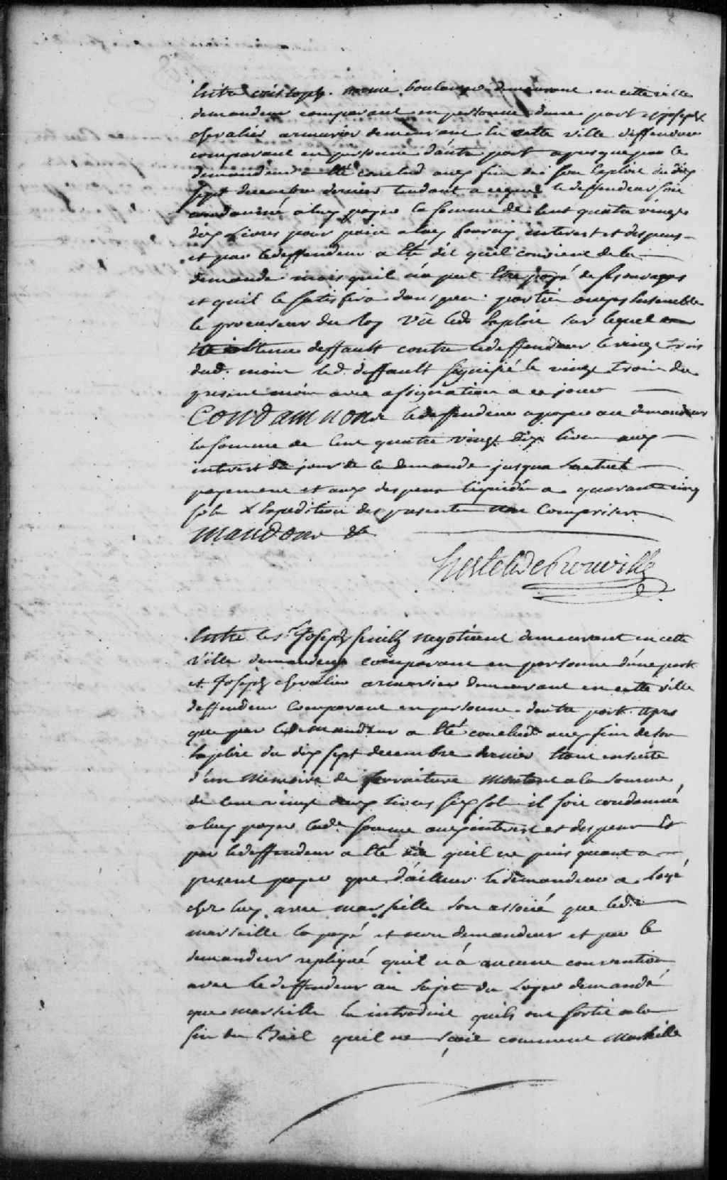 Le titre complet de la pièce se lit comme suit : Requête du sieur Joseph Senilh (Senil), négociant demeurant à Trois-Rivières, demandeur, contre Joseph Chevalier, armurier demeurant à Trois-Rivières, défendeur, pour que ce dernier soit condamné à payer au demandeur la somme 122 livres et 6 sols pour un mémoire de fournitures, et aux intérêts; le défendeur répond qu¿il ne peut payer présentement et que le demandeur ne lui a pas payé le loyer qu¿il a avec Marseille chez lui; le demandeur réplique que ledit Marseille l¿a introduit dans le loyer et qu¿il n¿a fait aucune convention avec le défendeur; le défendeur est condamné à payer au demandeur la somme de 122 livres et 6 sols, aux intérêts de cette somme et aux dépens liquidés à 3 livres et 10 sols.