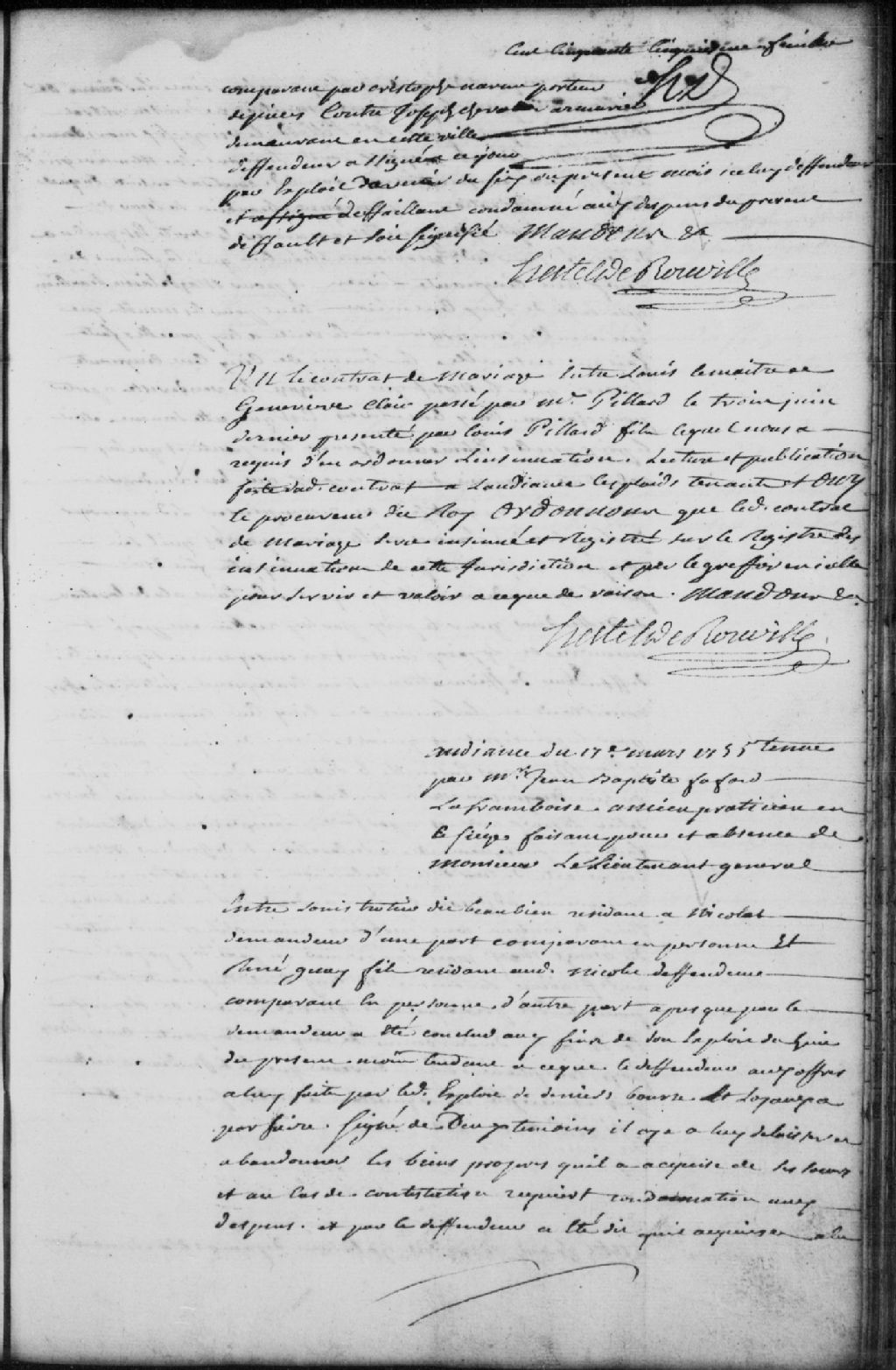 - Le titre complet de la pièce se lit comme suit : Acte de paiement à la requête de Louis Trotier (Trottier) dit Beaubien, résidant à Nicolet, demandeur, contre René Guay fils, résidant à Nicolet, défendeur, pour que ce dernier ait à délaisser et abandonner les biens propres qu¿il a acquis de ses soeurs; le défendeur répond qu¿il a acquis du demandeur à la condition de lui rembourser la somme de 1000 livres pour le principal mentionné en son contrat d¿acquisition passé par maître Pillard le 26 mars 1754 et 15 livres de loyaux coûts; la Cour adjuge au défendeur tout le contenu mentionné dans ledit contrat tant les mobiliers que les immobiliers à la condition qu¿il paie au demandeur la somme de 550 livres pour le sort principal et 15 livres de loyaux; le défendeur a payé comptant sur le bureau de la somme de 550 livres.