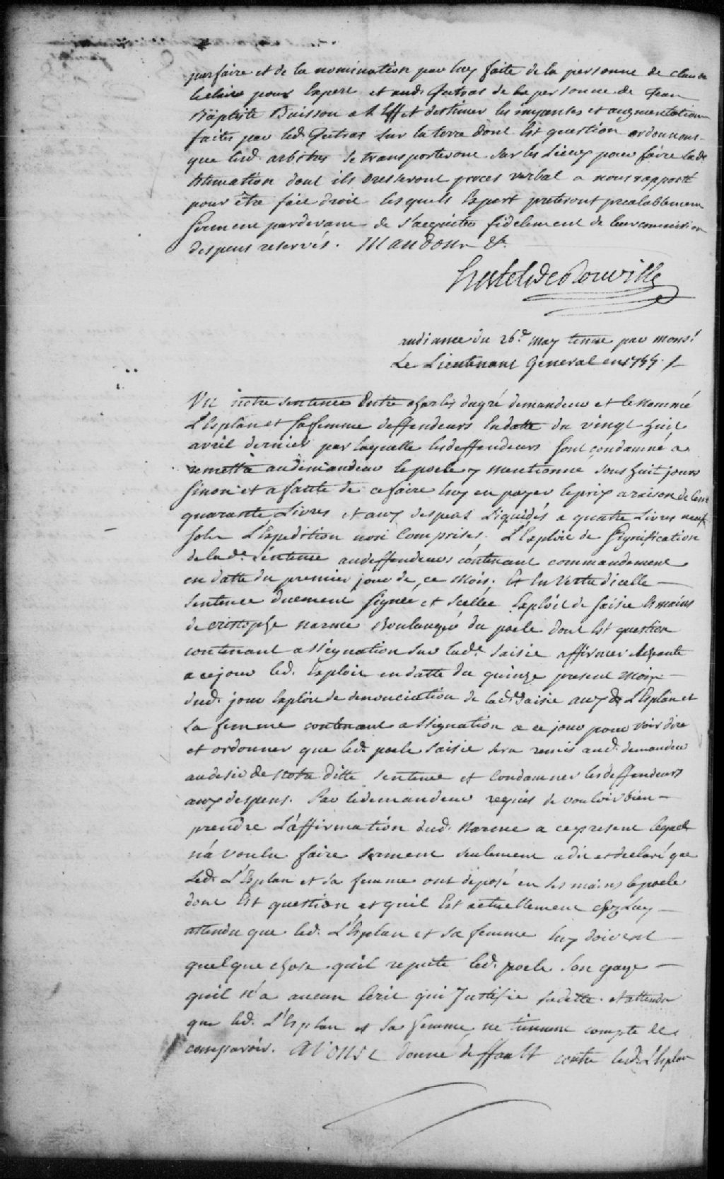 - Le titre complet de la pièce se lit comme suit : Défaut accordé à Charles Dugré, demandeur, contre L¿Esplan (Desplan, Lesplan) et sa femme, défendeurs non-comparant, faisant suite à la sentence du 28 avril 1755 qui condamne les défendeurs à remettre sous huitaine au demandeur le poêle qui y est mentionné sinon de lui en payer le prix de 140 livres, pour que le poêle saisi dans les mains de Narme soit remis au demandeur; ledit Narme n¿a pas voulu faire serment, mais a déclaré que ledit L¿Esplan et sa femme ont déposé dans ses mains un poêle qui est maintenant chez lui; la Cour ordonne que ledit Narme remettre audit Dugré ledit poêle et condamne les défendeurs aux dépens de la présente instance liquidés à 4 livres et 12 sols.