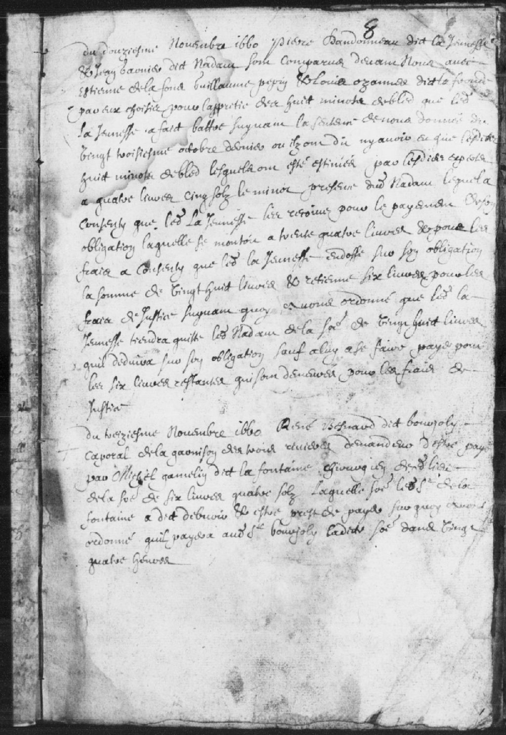 Requête de René Besnard (Bénard) dit Bourjoly (Bourgjoli - Bourjoli), caporal de la garnison des Trois-Rivières, contre Michel Gamelin dit Lafontaine, chirurgien, qu'il lui paye la somme de 6 livres, 4 sols; lequel est prêt à payer dans les 24 heures