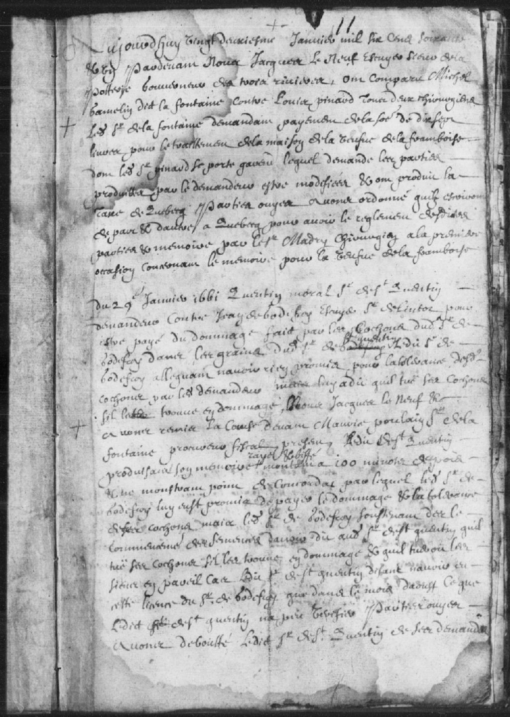 - Le titre complet de la pièce se lit comme suit : Requête de Quentin Moral (Morel), sieur de Saint-Quentin, demandeur, contre Jean Godefroy de Lintôt (Linctôt), pour être payé pour les dommages faits par ses cochons dans ses grains; lesquels cochons sont gardés en otage; Lintôt dit de les tuer s'ils ont causé du dommage, la cause est renvoyée devant Maurice Poulain (Poulin), sieur de La fontaine (Lafontaine), procureur fiscal, lequel a débouté Saint-Quentin de ses demandes n'ayant pu produire aucune pièce justificative de ses prétentions et obligations ni de promesse verbale ou écrite dudit sieur de Godefroy.