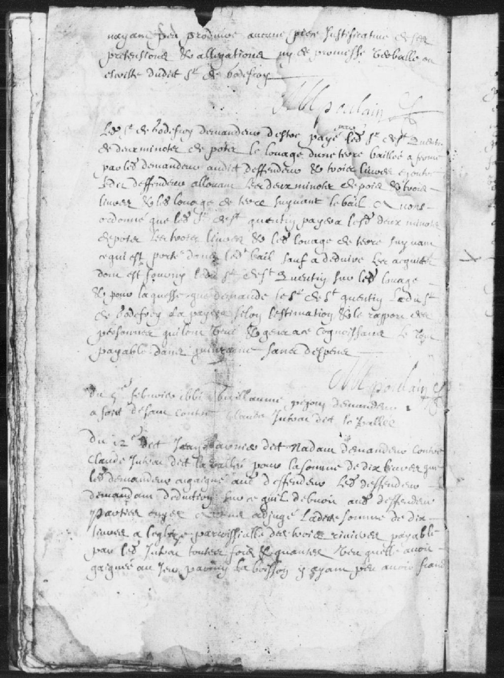 Requête de Jean Garnier dit Nadaut (Nadeau), demandeur, contre Claude Jutras dit la Vallée (Lavallée), pour qu'il lui paye la somme de 10 livres qu'il a gagné pour lui; la Vallée demande déduction sur ce que Nadaut lui doit, ladite somme sera allouée à l'église des Trois-Rivières parce que l'argent fut gagné au jeu parmi la boisson et qu'il pu y avoir fraude; payable par ledit Jutras