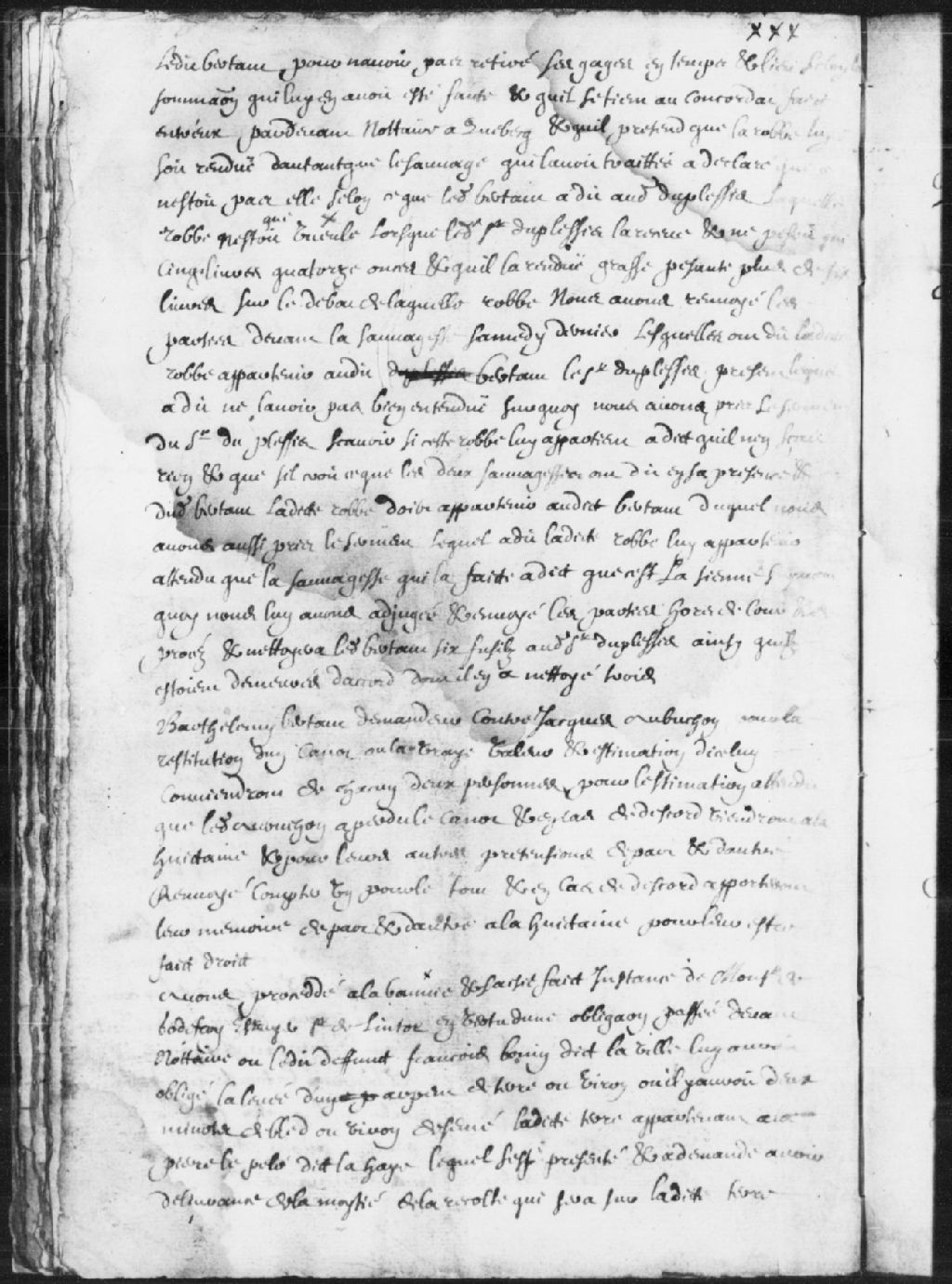 - Le titre complet de la pièce se lit comme suit : Adjudication des 2 minots de blé semés par feu François Bonin dit la Ville (Laville), saisie fait à l'instance de monsieur de Godefroy, écuyer, sieur de Lintot (Linctot), en vertu d'une obligation passée devant notaire où ledit défunt, François Bonin, se serait obligé de labourer d'un moins 1 arpent de terre, où il y aurait 2 minots de blé de semés; ladite terre appartenant à Pierre le pelé (Lepellé) dit la Haye (Lahaye, Lahaie); lequel demande la moitié de la récolte et achète l'autre moitié pour 22 livres.