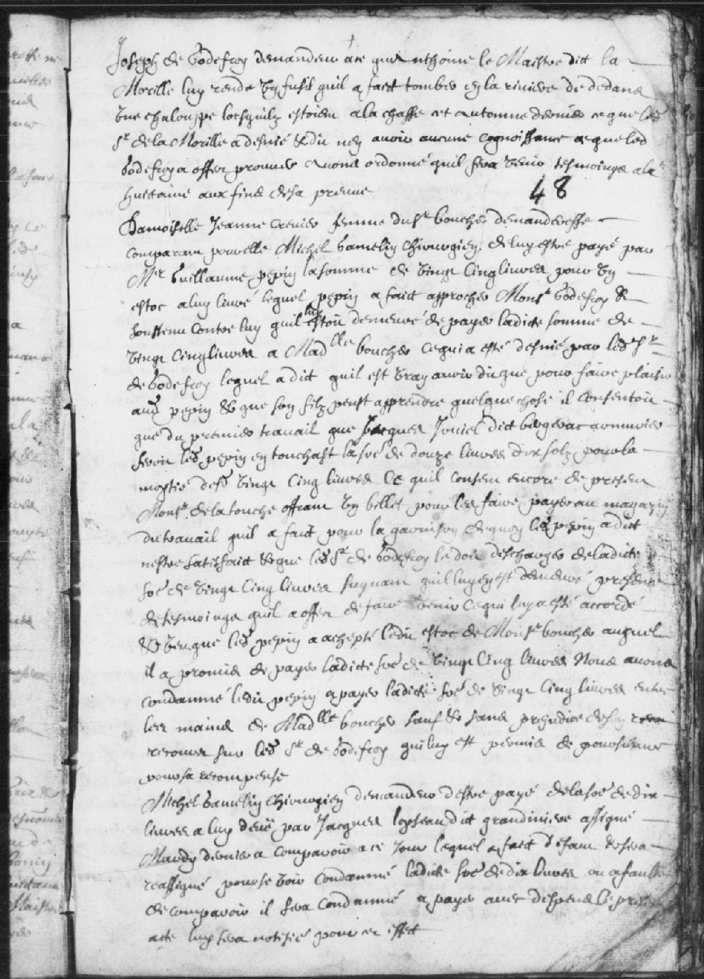 Requête de Jeanne Crevier, femme du sieur Boucher, demanderesse, comparant pour elle Michel Gamelin, chirurgien,contre Guillaume Pépin, pour qu'il lui paye la somme de 25 livres pour un estoc à lui livré; lequel Pépin a fait comparaître monsieur Godefroy, les deux parties argumentent; condamné ledit Pépin à payer la somme de 25 livres entre les mains de mademoiselle Boucher sauf et sans préjudice de son recours sur ledit sieur de Godefroy, qui lui est permis de poursuivre pour sa récompense