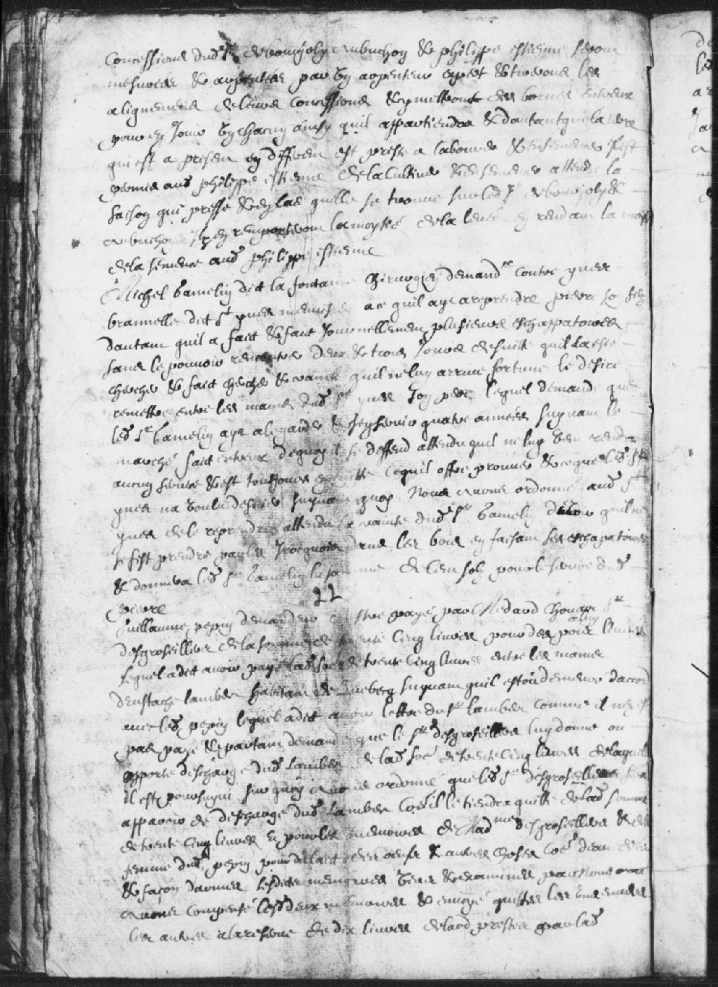 - Instance de Guillaume Pépin, demandeur, à l'encontre de Médard Chouart, sieur Desgroseillers, lui réclamant la somme de 35 livres pour des pois à lui livrés; lequel dit les avoir payés à Eustache Lambert de Québec...
