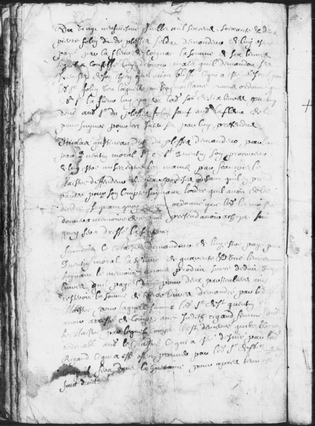 Requête de François le Maistre (Lemaître), demandeur, de lui être payé par Quentin Moral la somme de 41 livres suivant son mémoire; déduit 11 livres qu'il paye et doit pour 2 particuliers; Moral dit avoir arrêté de compte avec Judith Rigaud, femme dudit le Maistre, il ne lui doit plus rien; ladite Rigaud a nié; ledit Moral offre de prouver, ce qu'il fera dans huitaine pour après leur être fait droit